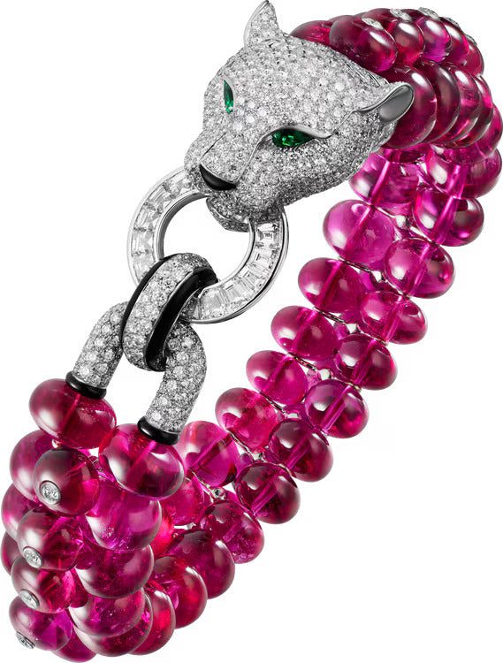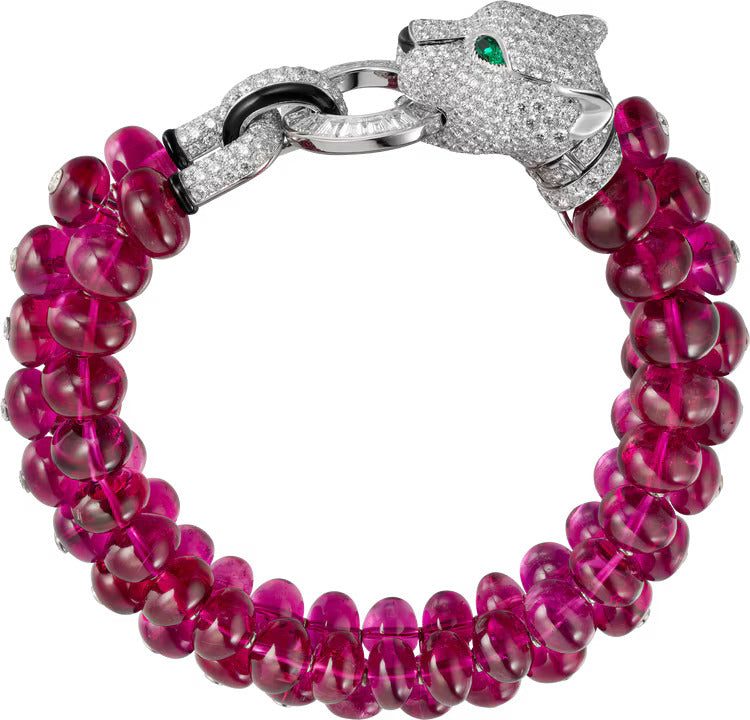 Bracelet - white gold (750/1000), rubellite beads, onyx, emerald eyes, calibrated diamonds, brilliant-cut diamonds.
