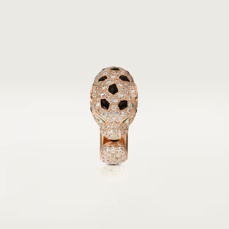 Panthère de Cartier ring, 18K rose gold (750/1000), onyx, set with 2 emeralds and 242 brilliant-cut diamonds totaling 2.21 carats (for size 52).