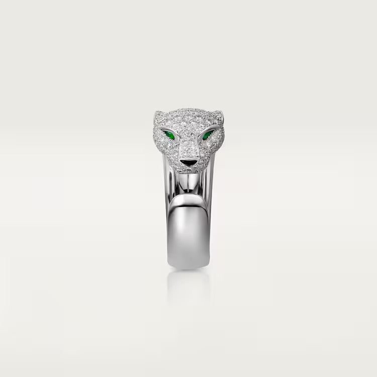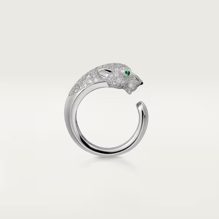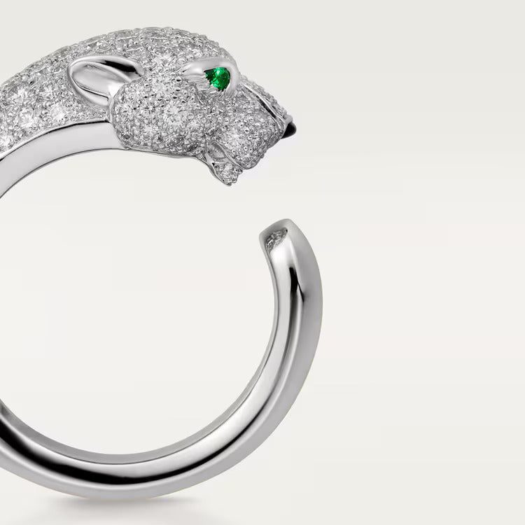 Panthère de Cartier ring, white gold 750/1000, set with 137 brilliant-cut diamonds totaling 1.15 carats, emeralds, onyx. Width of the pattern: 11.05 mm (for size 52).