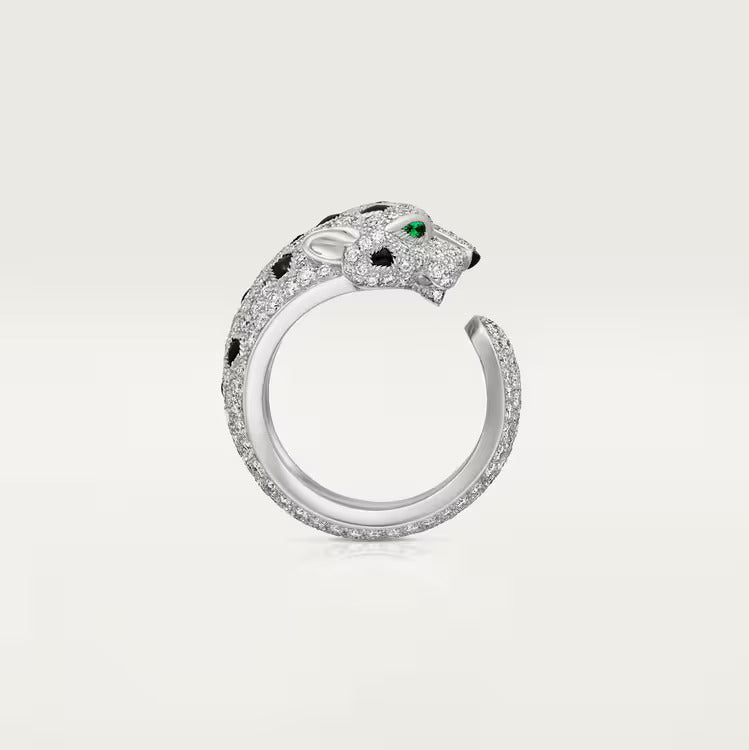 Panthère de Cartier ring, 18K white gold (750/1000), onyx, set with 2 emeralds and 242 brilliant-cut diamonds totaling 2.21 carats. Width of the pattern: 11.05 mm (for size 52).