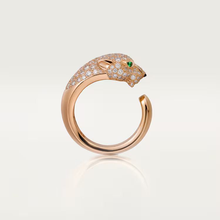 Panthère de Cartier ring, rose gold 750/1000, set with 137 brilliant-cut diamonds totaling 1.15 carats, emeralds, onyx. Width of the pattern: 11.05 mm (for size 52).