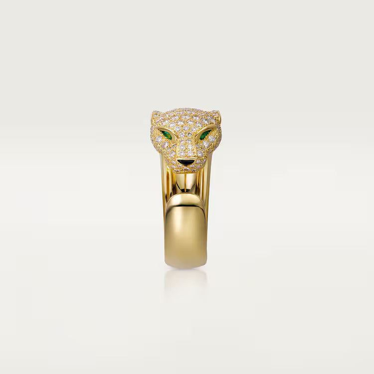 Panthère de Cartier ring, yellow gold 750/1000, set with 137 brilliant-cut diamonds totaling 1.15 carats, emeralds, onyx. Width of the pattern: 11.05 mm (for size 52).
