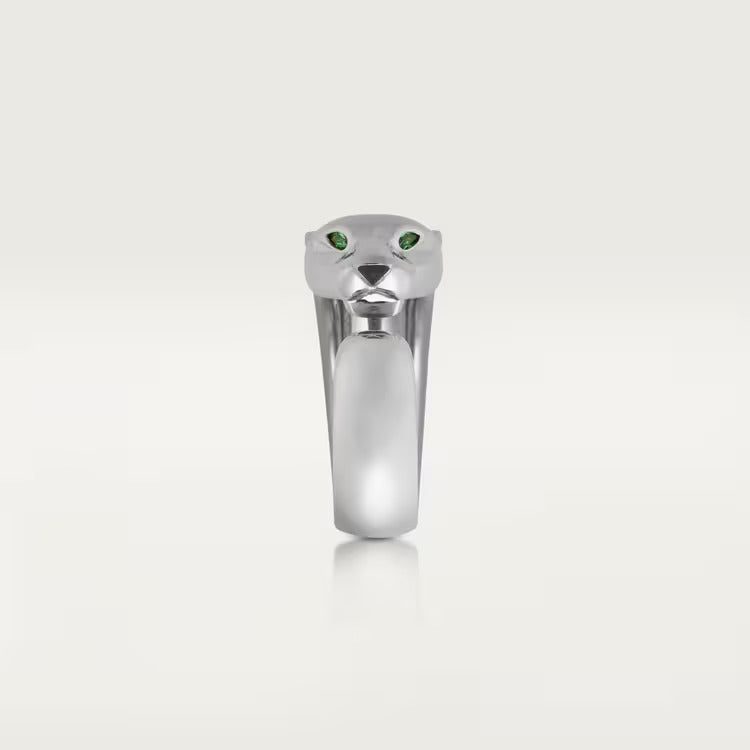 Panthère de Cartier ring, 18K white gold (750/1000), tsavorite garnets, onyx. Width of the pattern: 11 mm (for size 52).