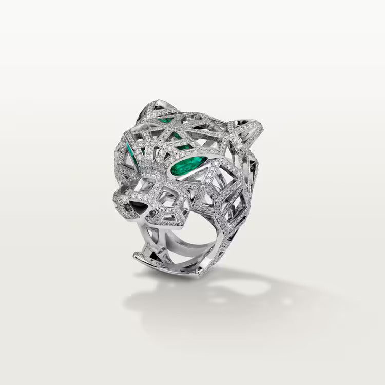 Panthère de Cartier ring, white gold 750/1000, set with 545 brilliant-cut diamonds totaling 1.47 carats, emeralds, onyx (for size 52). Width of the pattern according to metrics: 26.94 to 31.16 mm.