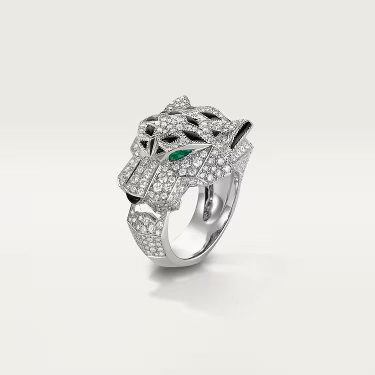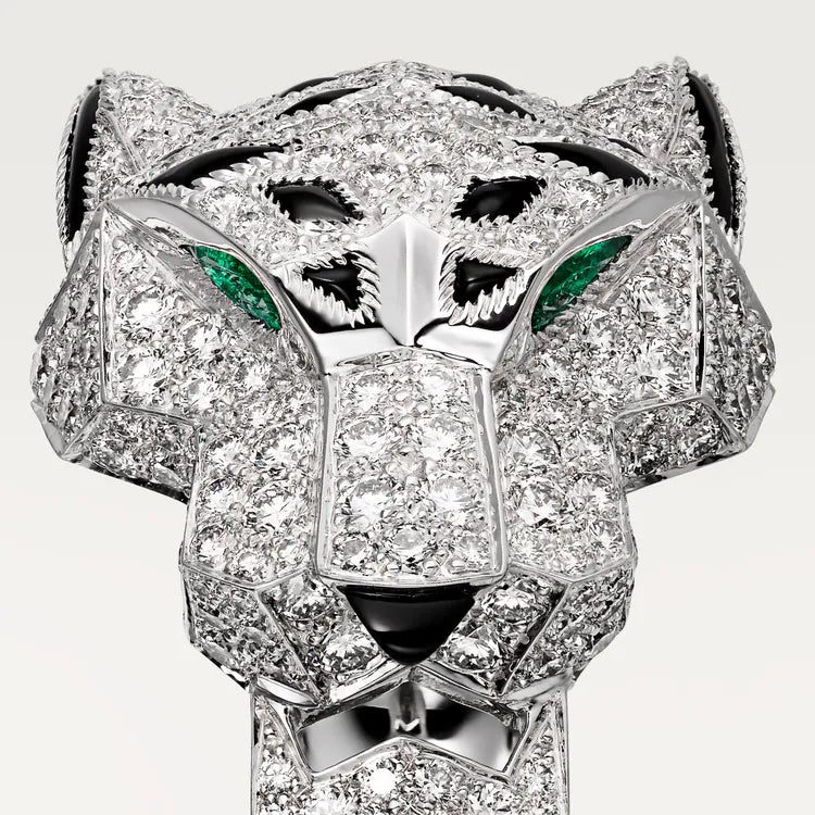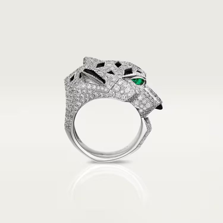 Panthère de Cartier ring, white gold 750/1000, set with 365 brilliant-cut diamonds totaling 2.55 carats, emeralds, onyx. Width of the pattern: 18.6 mm (for size 52).