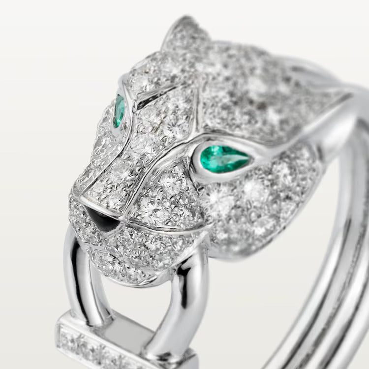 Panthère de Cartier ring, white gold 750/1000, set with 81 brilliant-cut diamonds totaling 0.75 carats, emeralds, onyx. Width of the pattern: 10.7 mm (for size 52).