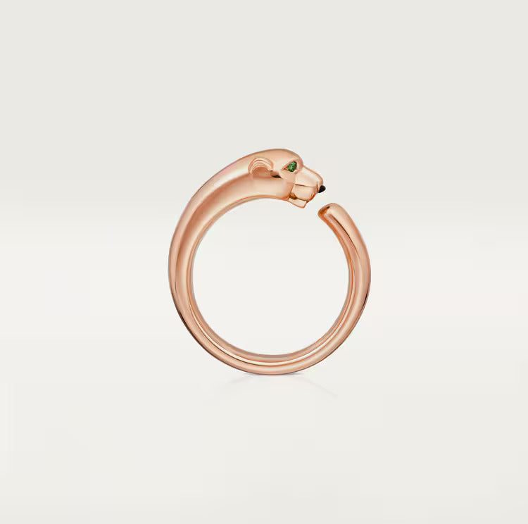 Panthère de Cartier ring, rose gold 750/1000, onyx, set with 2 tsavorite garnets (for size 52). Width of the pattern: 7.31 mm (for size 52).