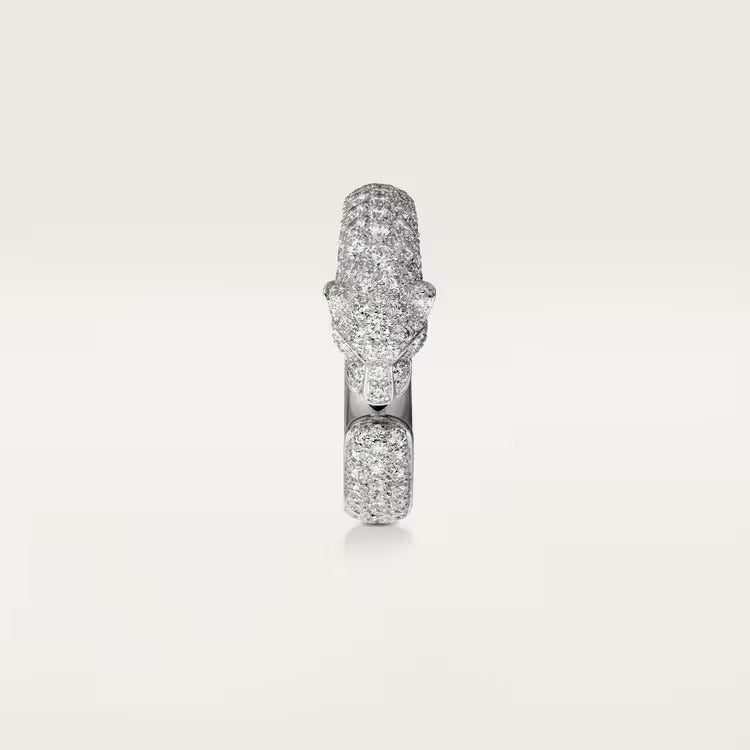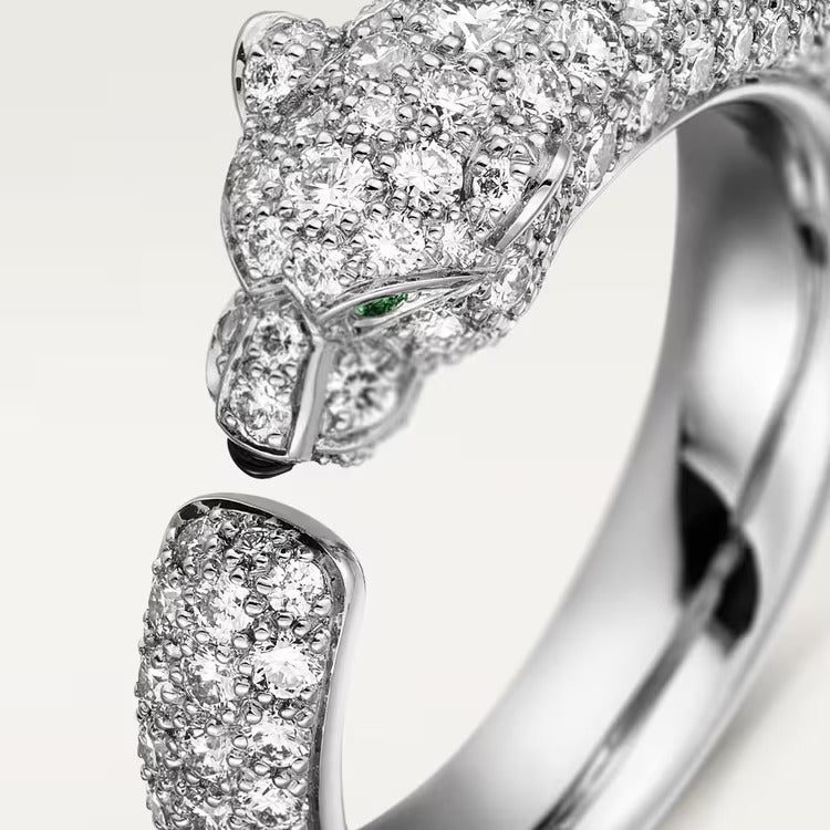Panthère de Cartier ring, 18K white gold (750/1000), onyx, set with 2 emeralds and 112 brilliant-cut diamonds totaling 0.95 carat. Width of the pattern: 7.31 mm (for size 52).