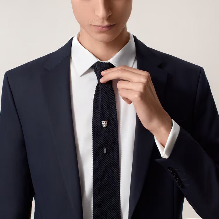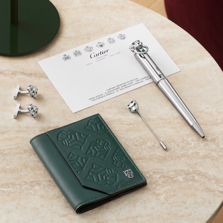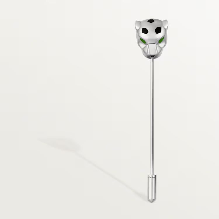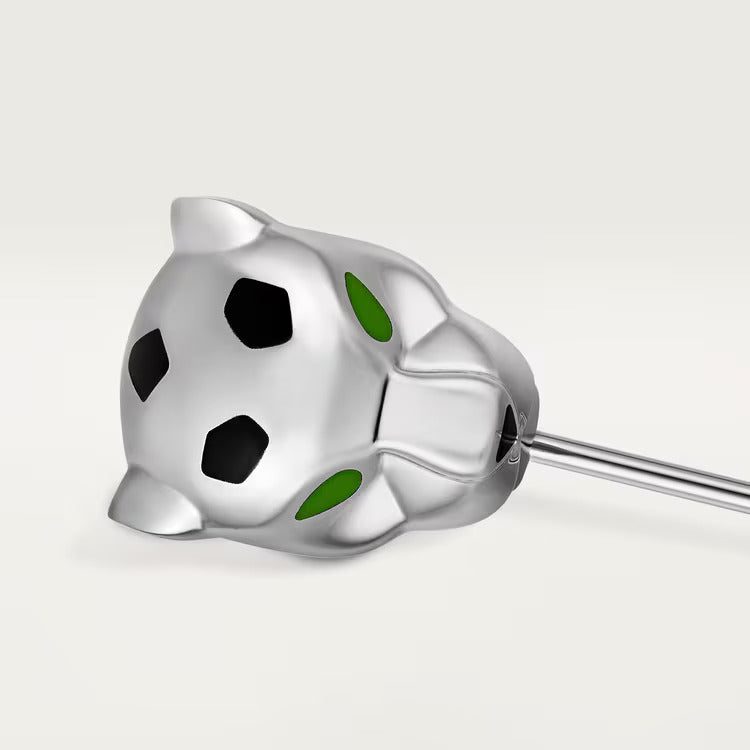 Panthère de Cartier tie pin in palladium-finish sterling silver 925/1000, black and green lacquer. Head dimensions: 16 x 13 mm; 49 mm tie pin