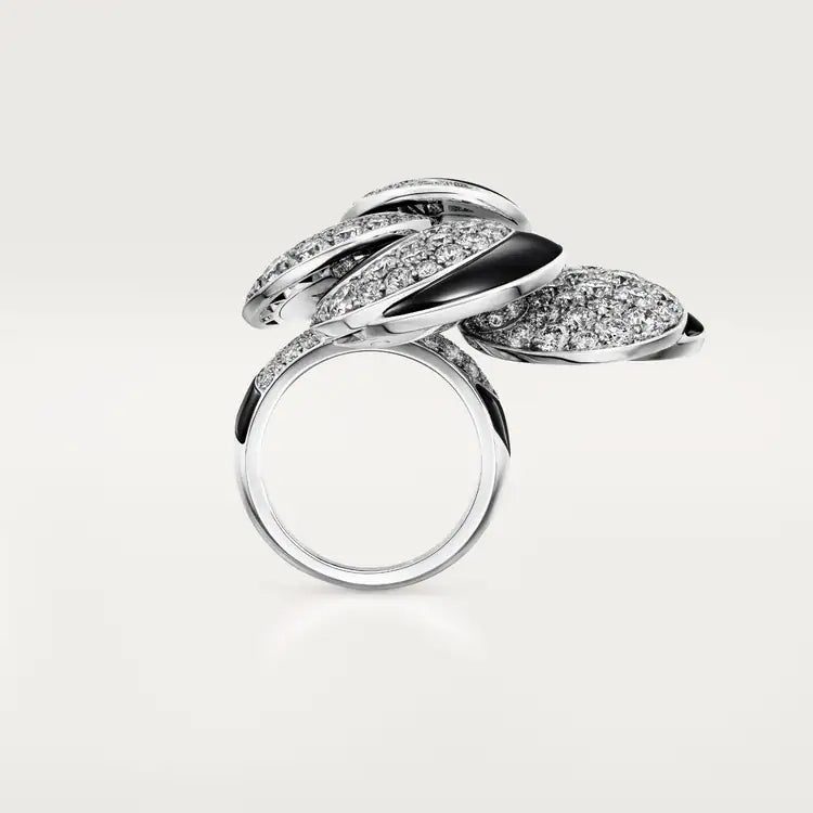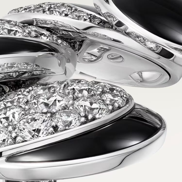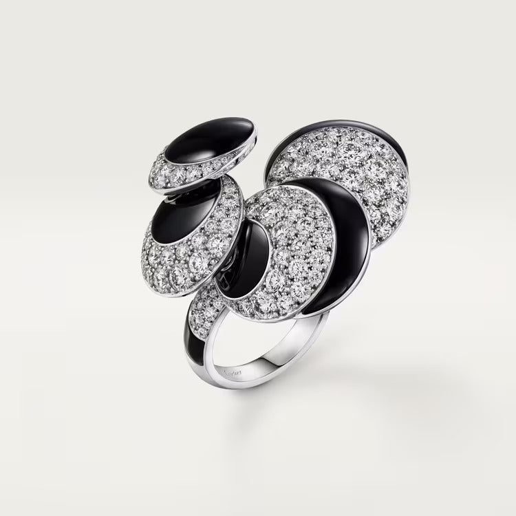 Polymorph ring, 18K white gold (750/1000), set with 7 onyx and 154 brilliant-cut diamonds totaling 6.30 carats (size 52).