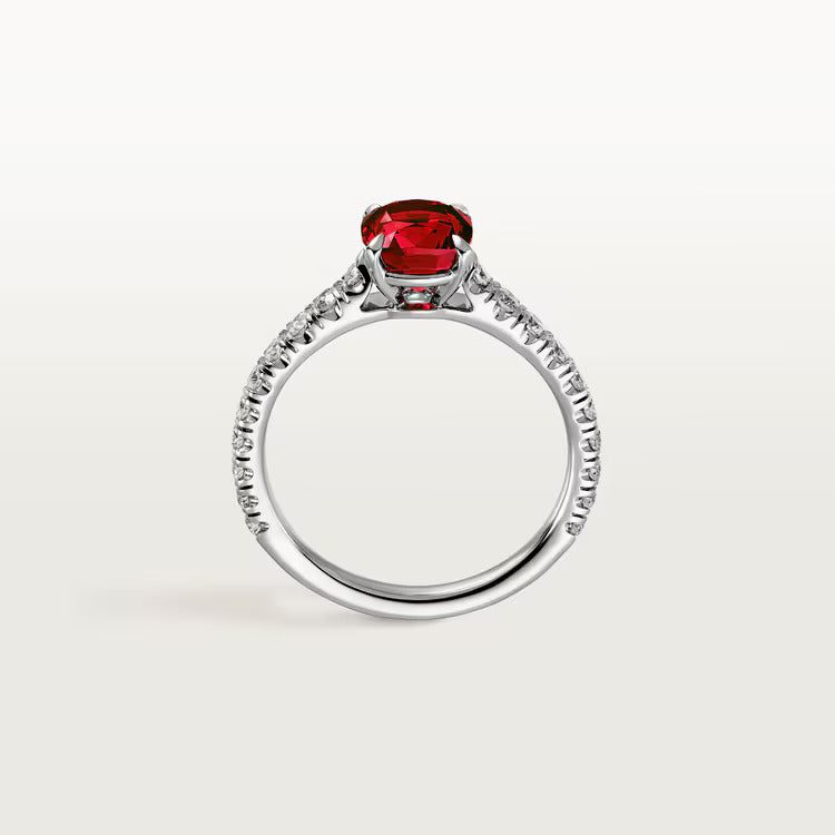 1895 solitaire, platinum 950/1000, set with an cushion-cut rubies available from 1.00 to 1.99 carats, and paved with brilliant-cut diamonds.