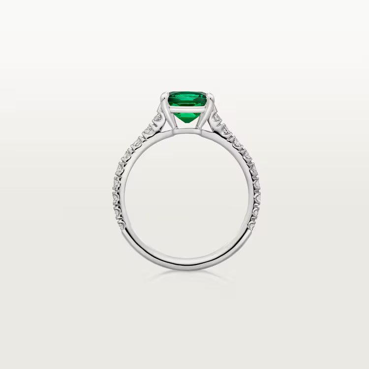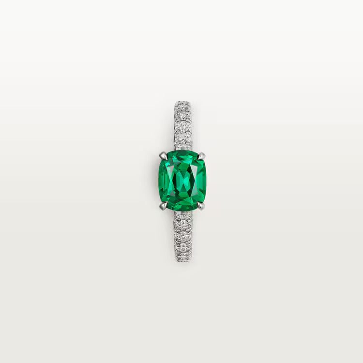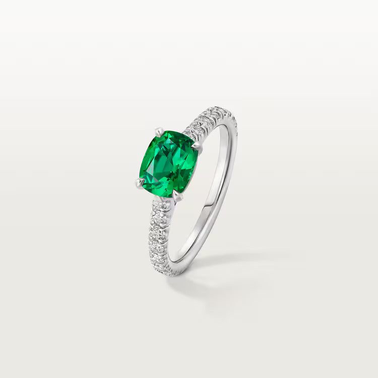 1895 solitaire, platinum 950/1000, set with a cushion-cut emerald available from 1.00 to 1.99 carats, and paved with brilliant-cut diamonds.