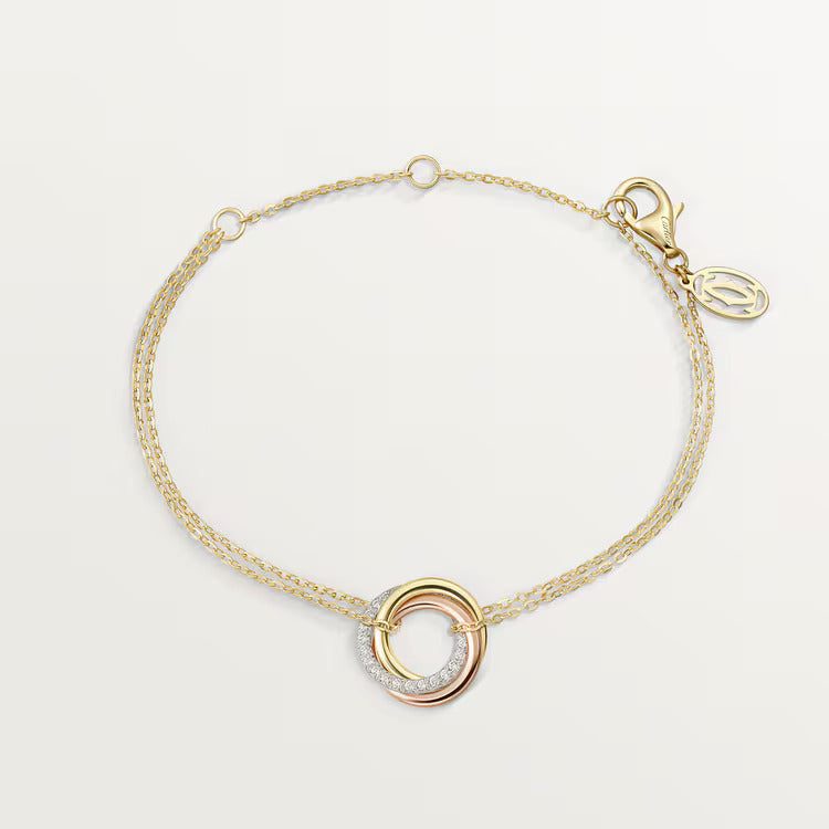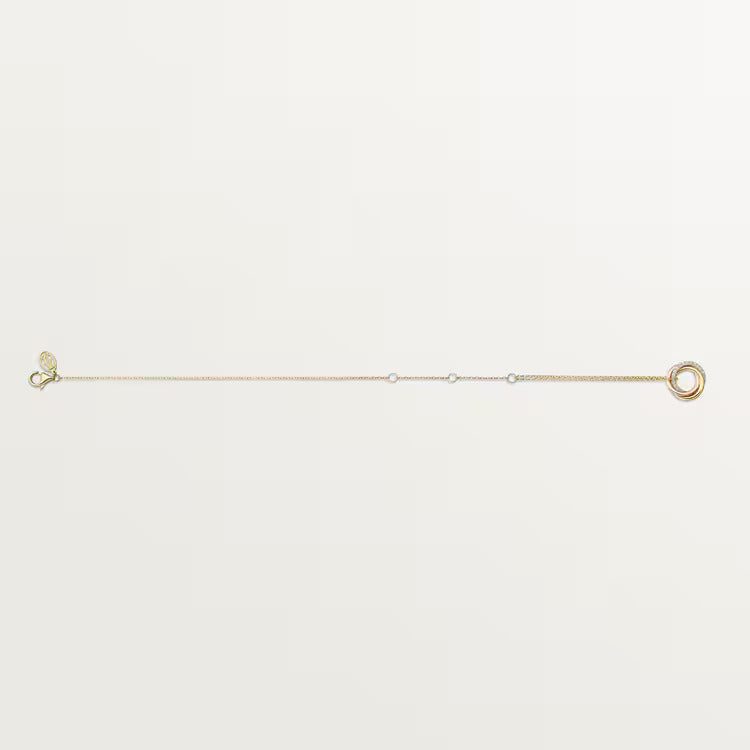 Trinity bracelet, classic model, 18K white gold (750/1000), 18K yellow gold (750/1000), 18K rose gold (750/1000), 18K yellow gold (750/1000) chain, set with 25 diamonds totaling 0.19 carats (for size 18). Adjustable chain length: 13–15 cm (for size 15) and 16–18 cm (for size 18).