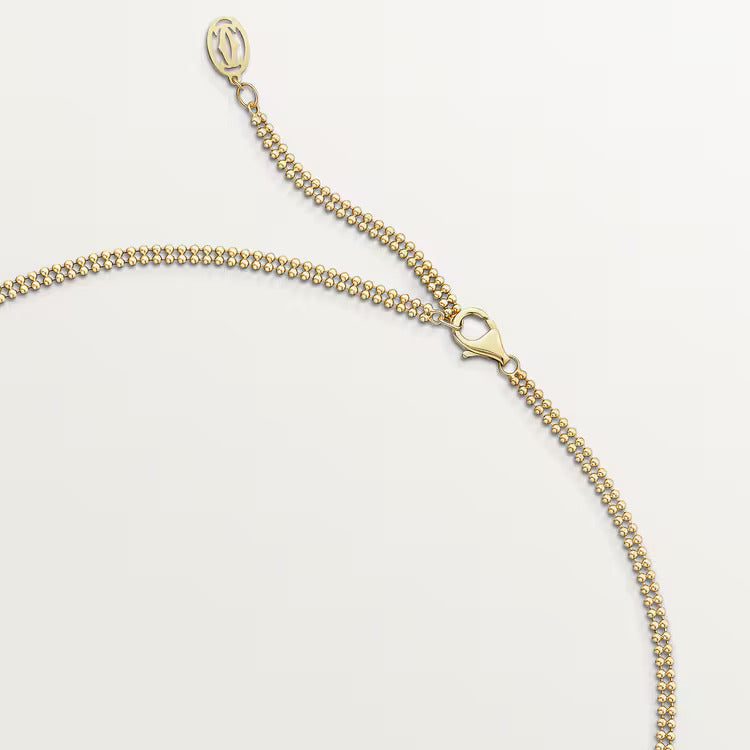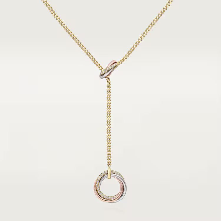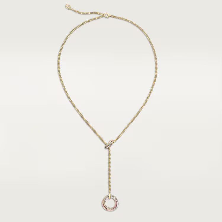 Trinity necklace, 18K white gold (750/1000), 18K white gold (750/1000), 18K yellow gold (750/1000), set with 44 brilliant-cut diamonds totaling 0.34 carats, 18K yellow gold (750/1000) chain. Adjustable chain length: 38–42 cm.