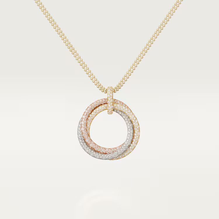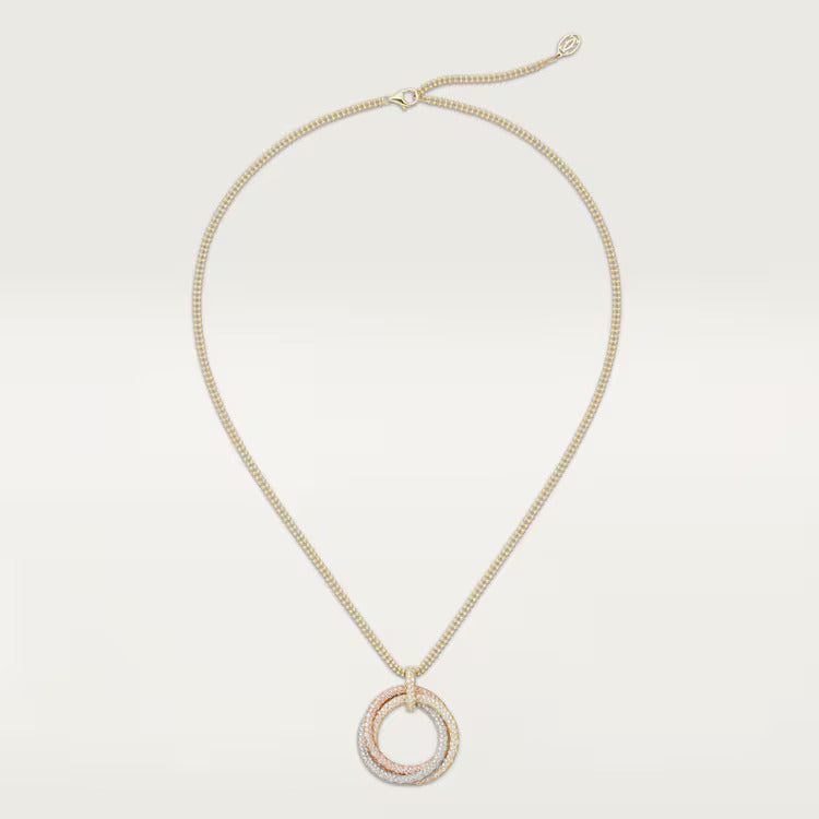 Trinity necklace, large model, 18K white gold (750/1000), 18K rose gold (750/1000), 18K yellow gold (750/1000), 18K yellow gold (750/1000) chain, set with 349 brilliant-cut diamonds totaling 1.74 carats. Inner diameter: 26.7 mm. Adjustable chain length: 42-46 cm.