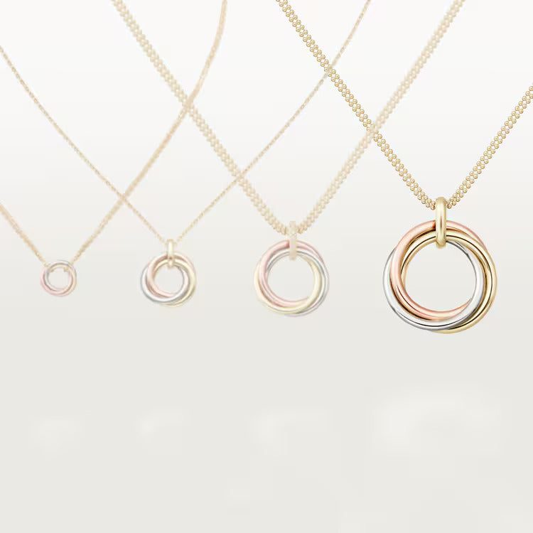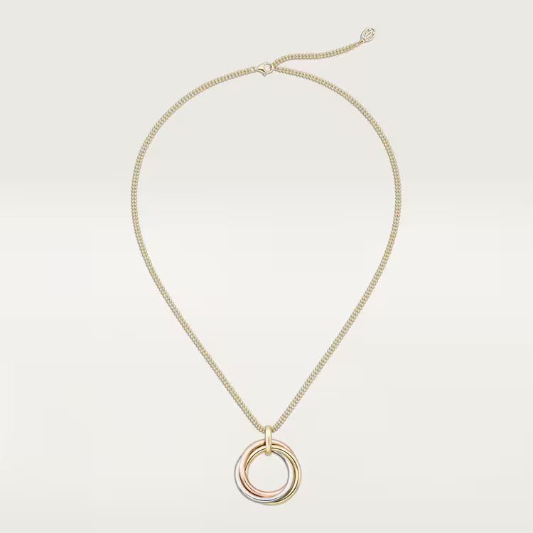 Trinity necklace, large model, 18K white gold (750/1000), 18K rose gold (750/1000), 18K yellow gold (750/1000), 18K yellow gold (750/1000) chain. Inner diameter: 26.7 mm. Adjustable chain length: 42-46 cm.