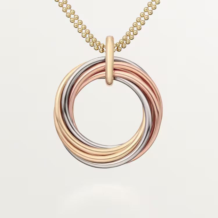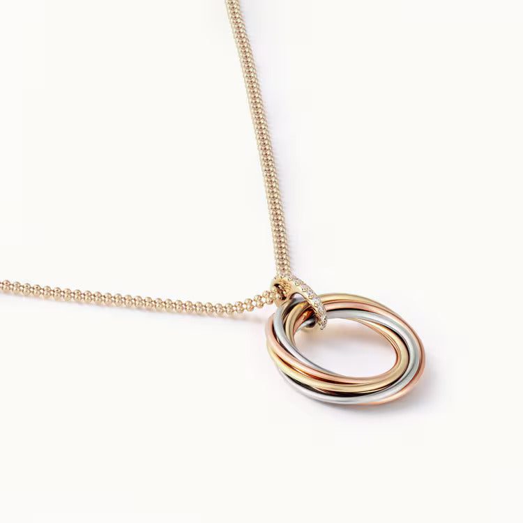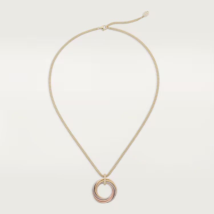 Trinity necklace, 18K white gold (750/1000), 18K rose gold (750/1000),18K yellow gold (750/1000), set with 11 brilliant-cut diamonds totaling 0.08 carats, 18K yellow gold (750/1000) chain. Adjustable chain length: 38-42 cm.