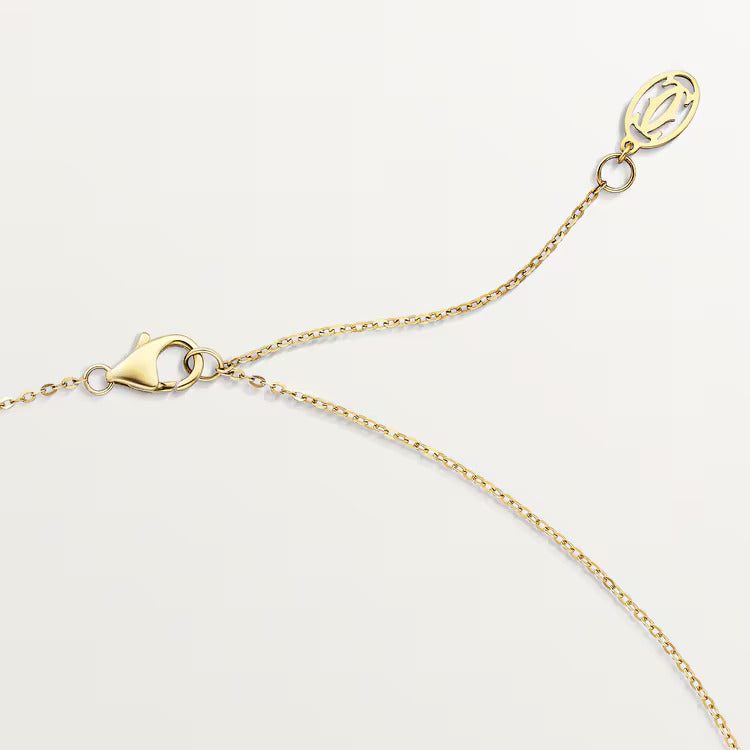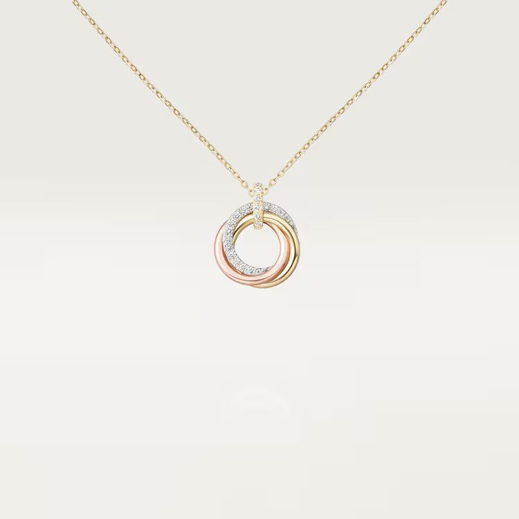 Trinity necklace, 18K white gold (750/1000), 18K yellow gold (750/1000), 18K rose gold (750/1000), set with 33 diamonds totaling 0.25 carats, 18K yellow gold (750/1000) chain. Adjustable chain length: 38–42 cm.