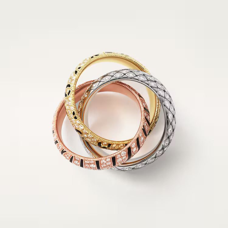 Trinity ring, 18K white gold (750/1000), 18K rose gold (750/1000), 18K yellow gold (750/1000), black lacquer, set with 378 brilliant-cut diamonds totaling 1.65 carats.