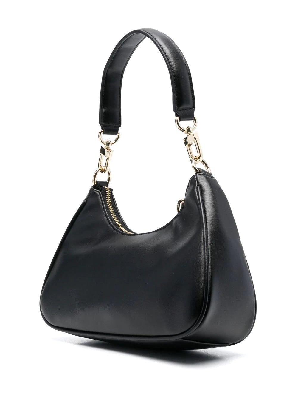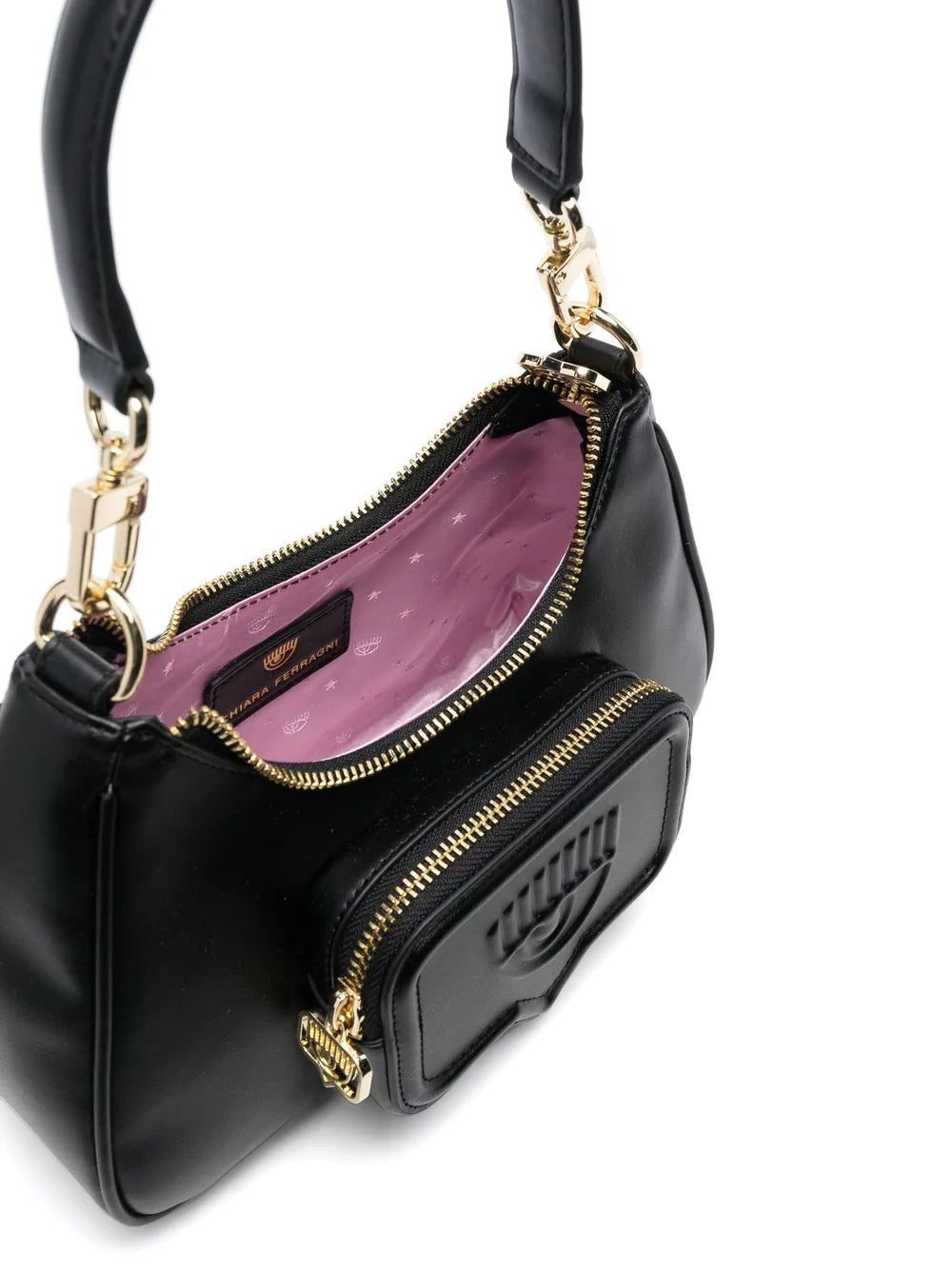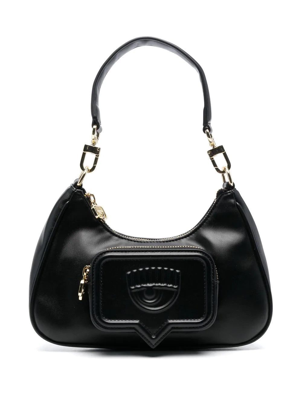 debossed-logo shoulder bag from CHIARA FERRAGNI featuring black, faux leather, debossed logo to the front, front zip-fastening pocket, gold-tone hardware, gold-tone logo plaque, top zip fastening, internal logo patch, main compartment and long top handle.