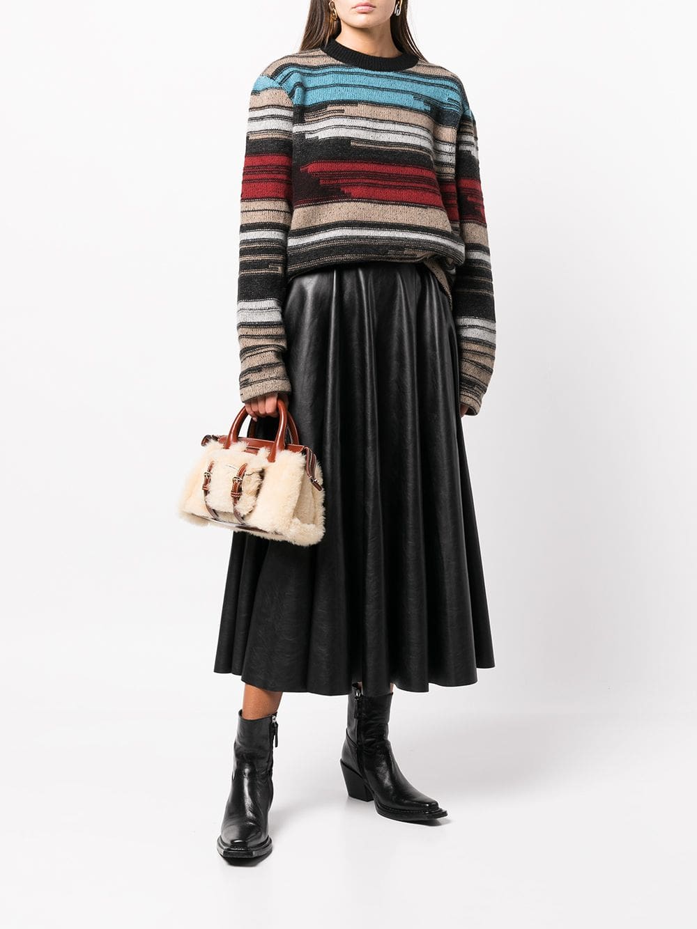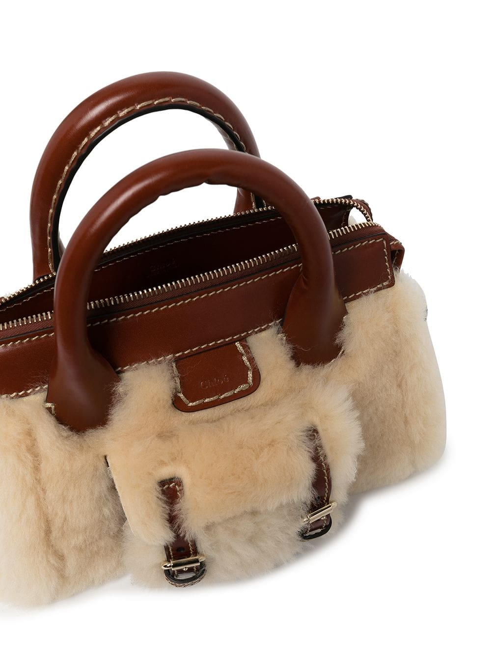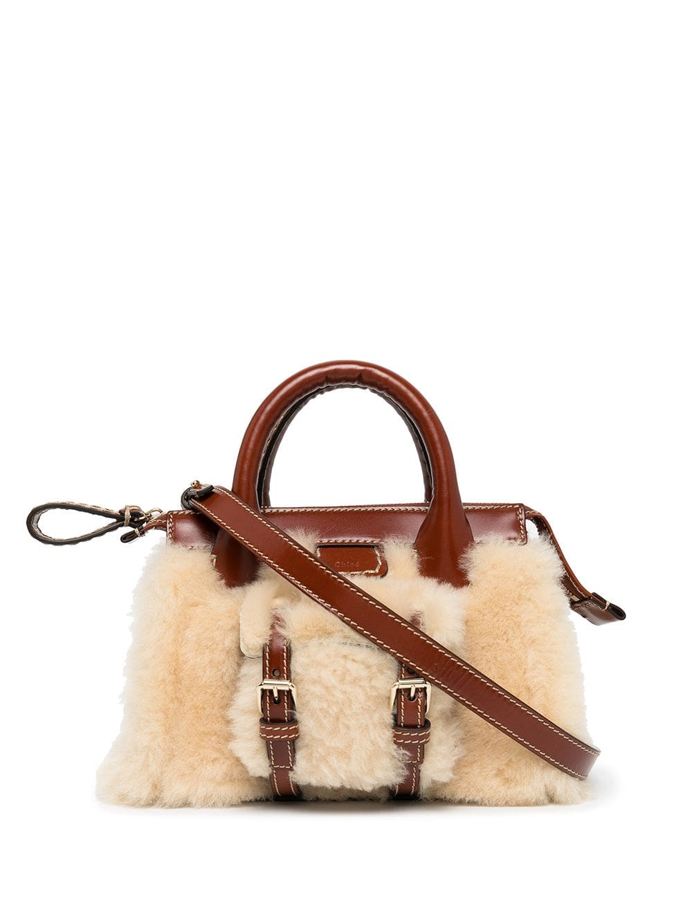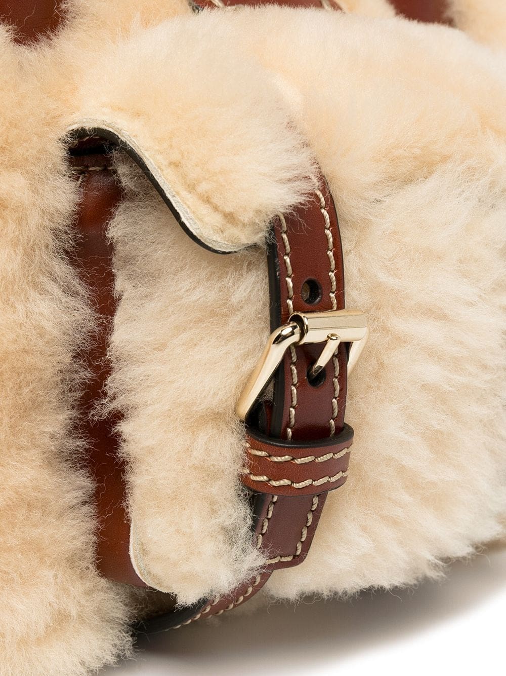 sepia brown leather shearling trim logo tag two rounded top handles detachable shoulder strap top zip fastening main compartment internal zip-fastening pocket front buckle-fastening pocket
