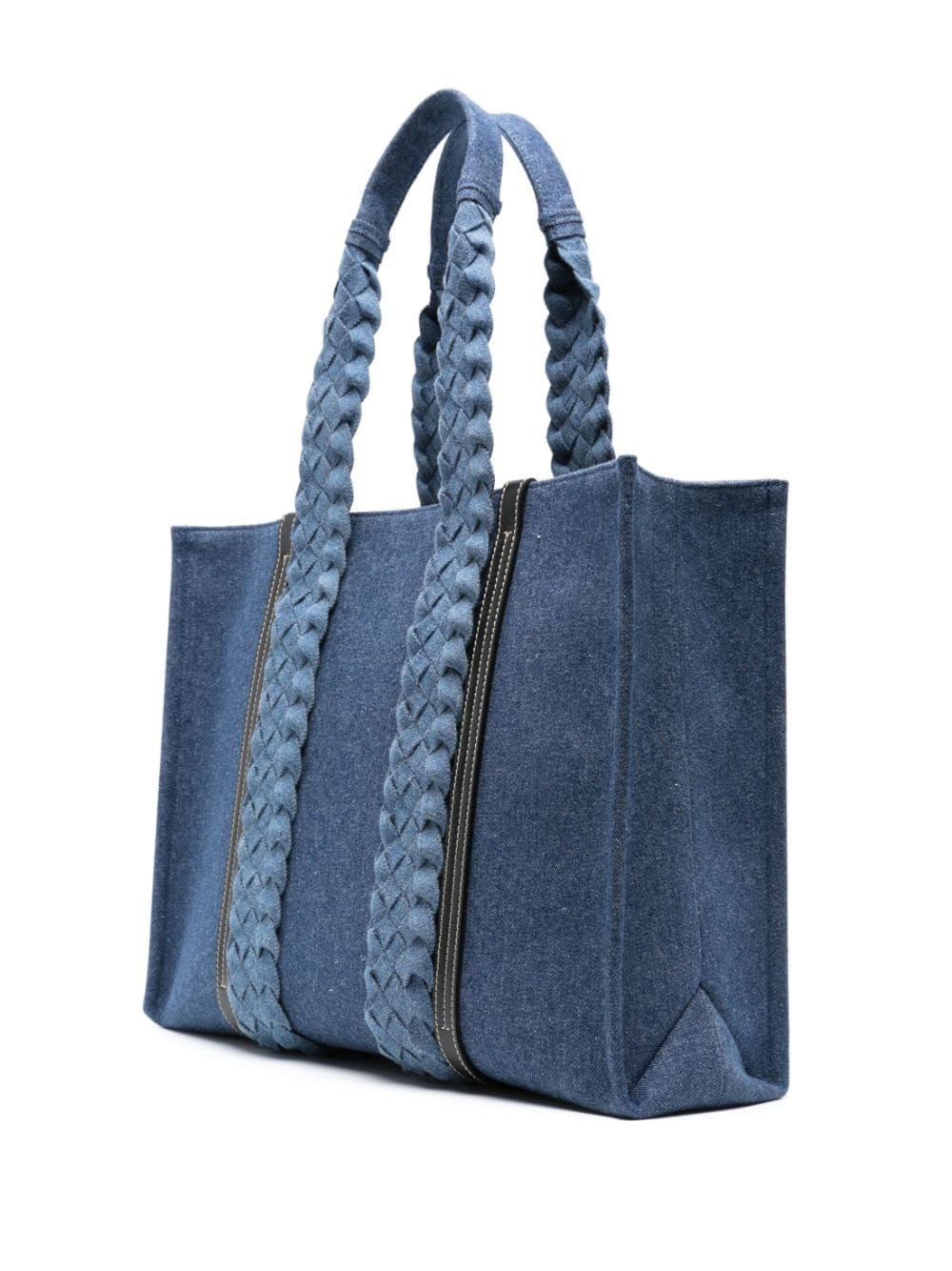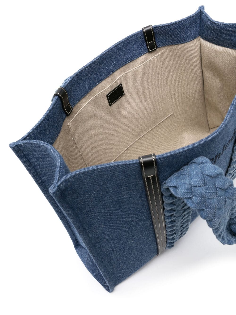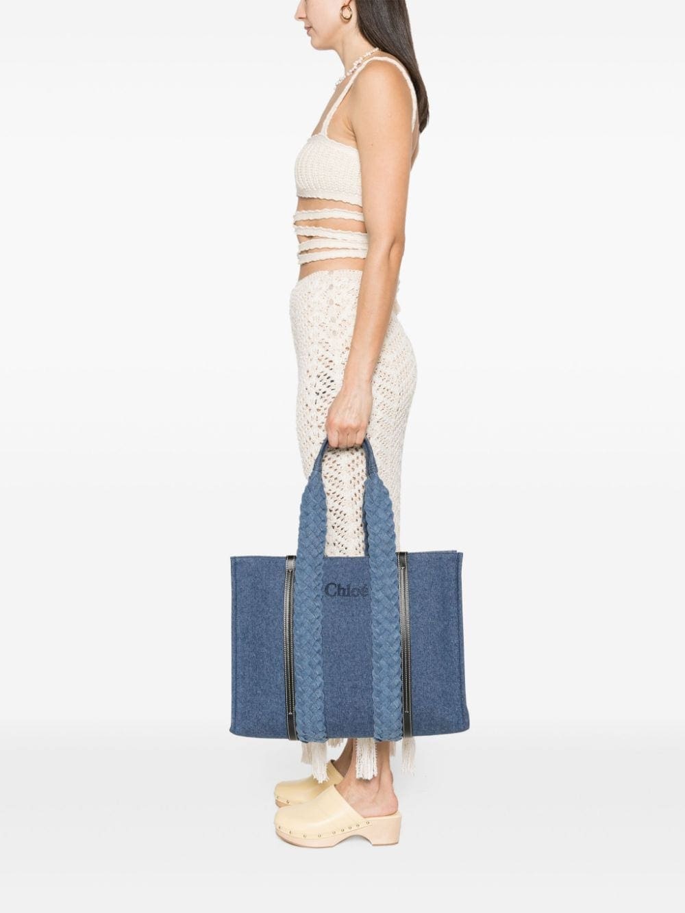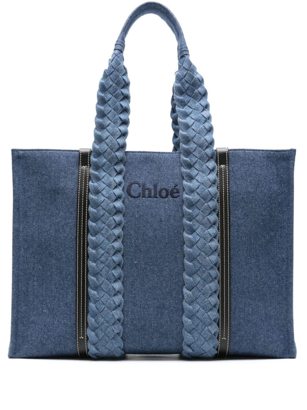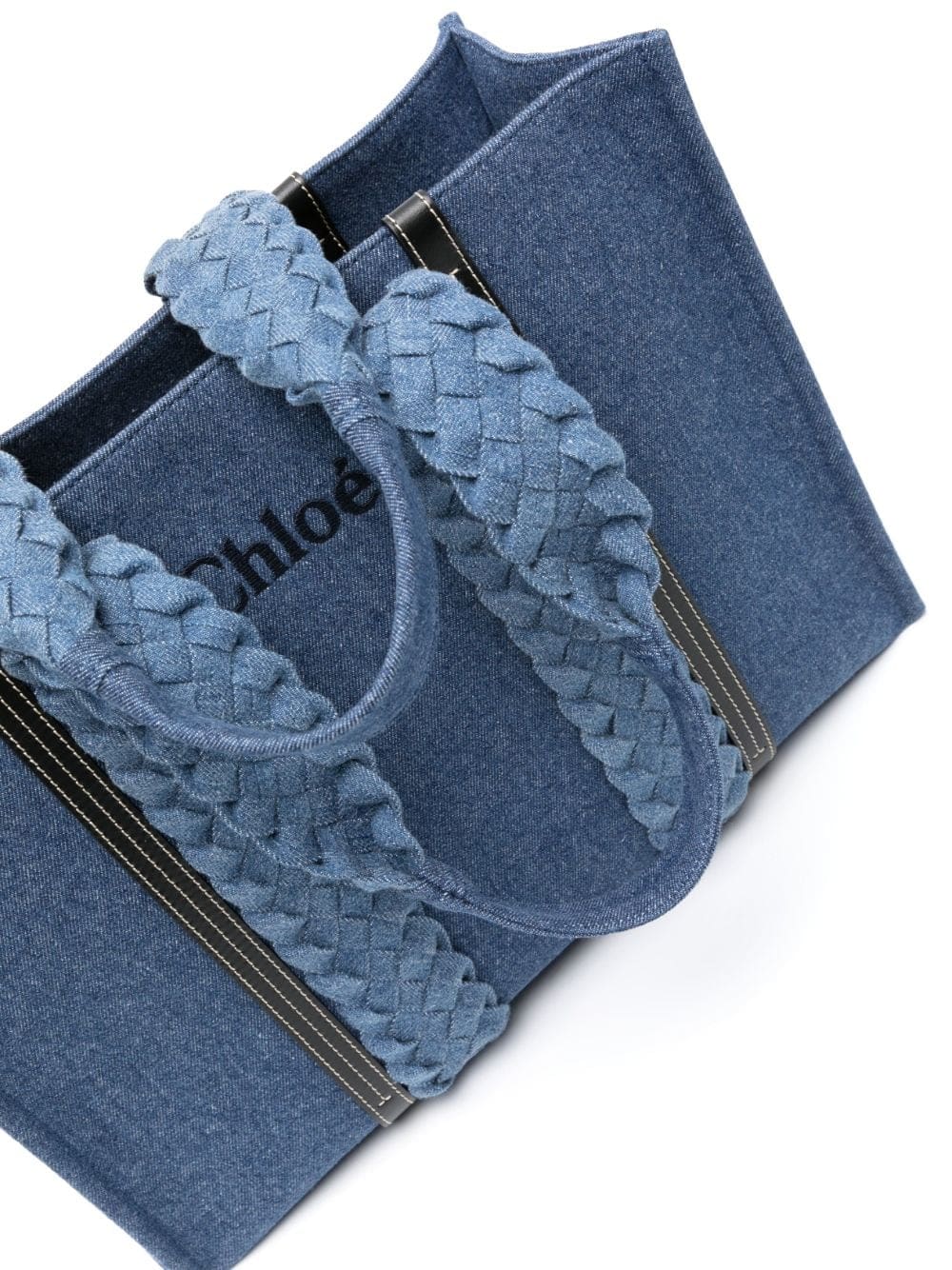 Chloé's Woody tote takes its name and embroidered logo from the signature namesake mules. It’s crafted from recycled denim to a capacious silhouette with leather trims and hand-braided handles for craftsmanship detail.