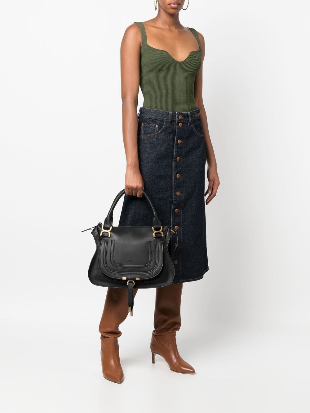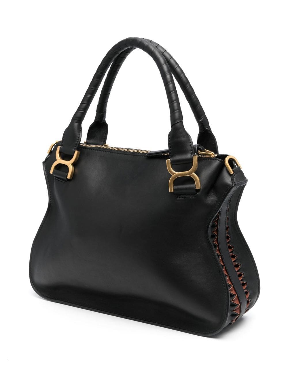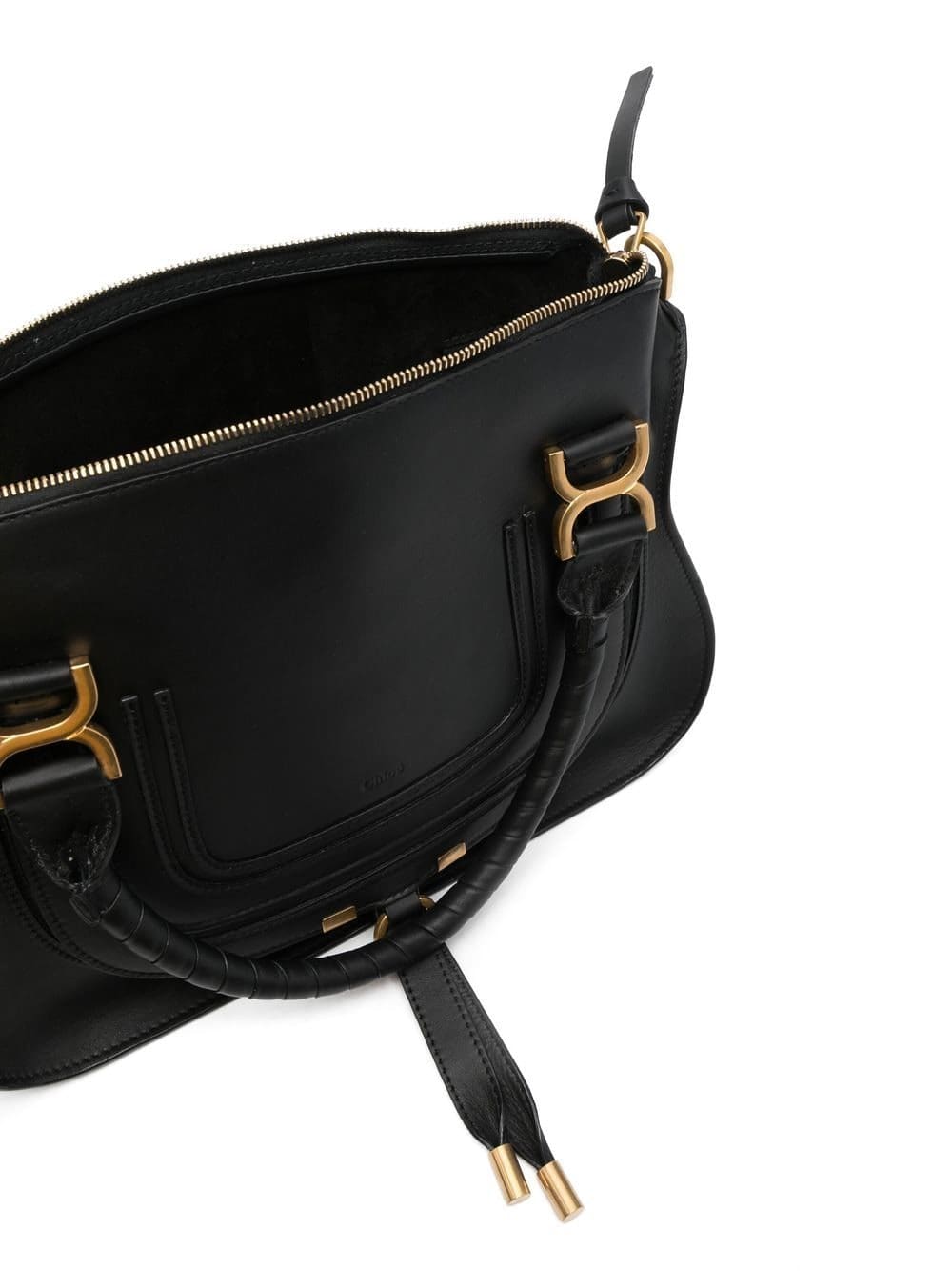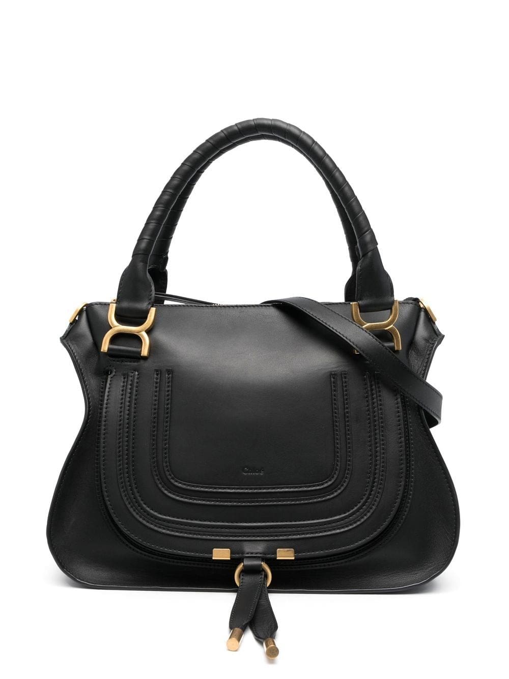 black calf leather gold-tone hardware embossed logo to the front panelled design front flap closure two top handles single shoulder strap main compartment