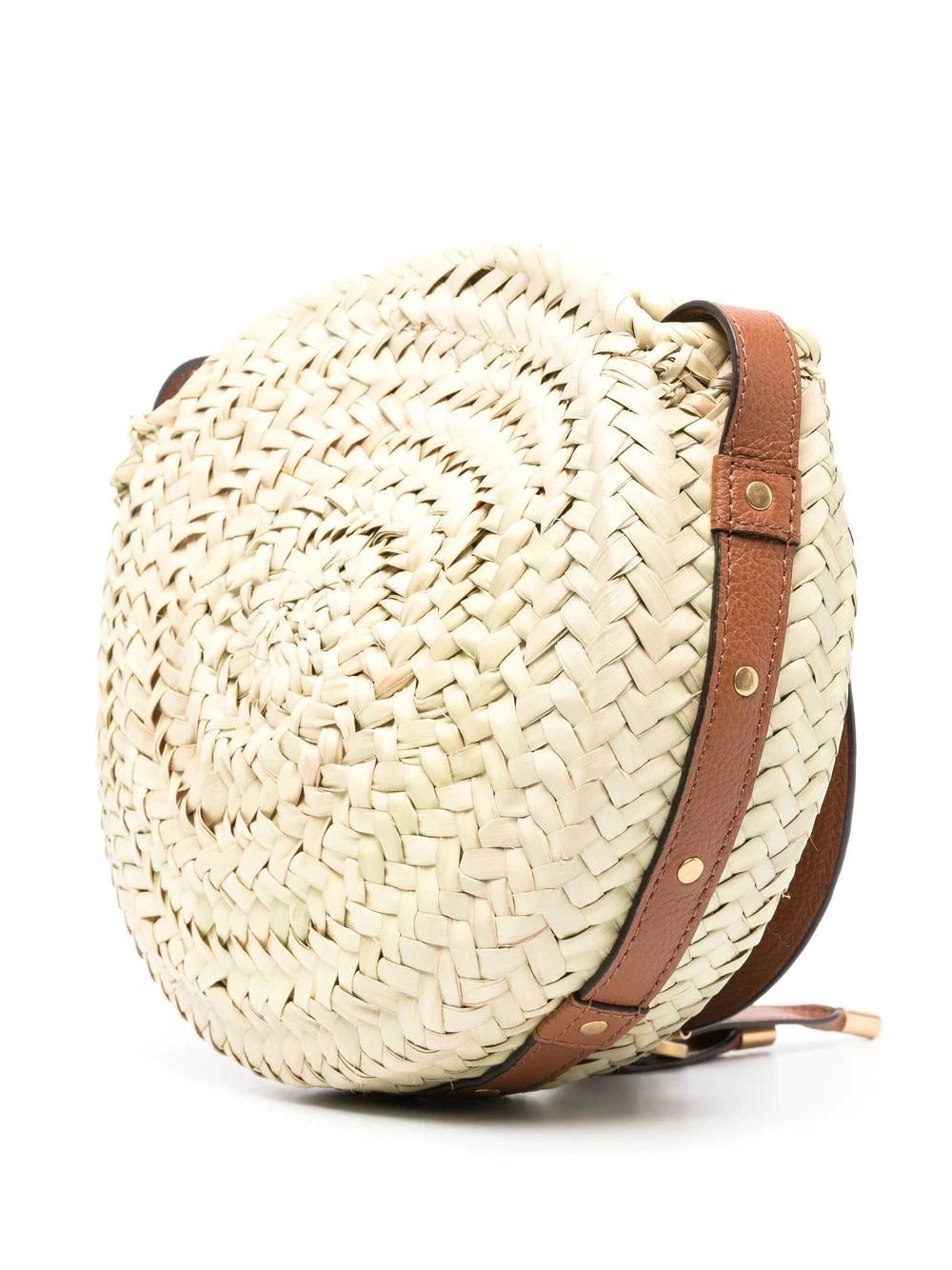 Marci Raffia crossbody bag from CHLOÉ featuring beige, brown, calf leather, woven raffia design, debossed logo to the front, single shoulder strap and main compartment.