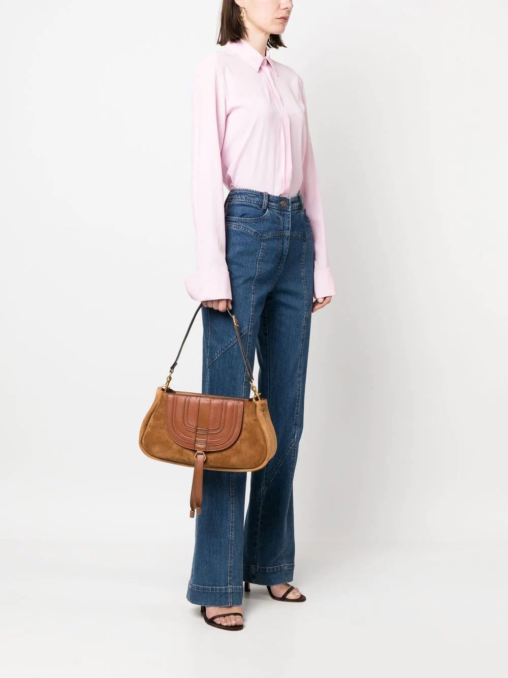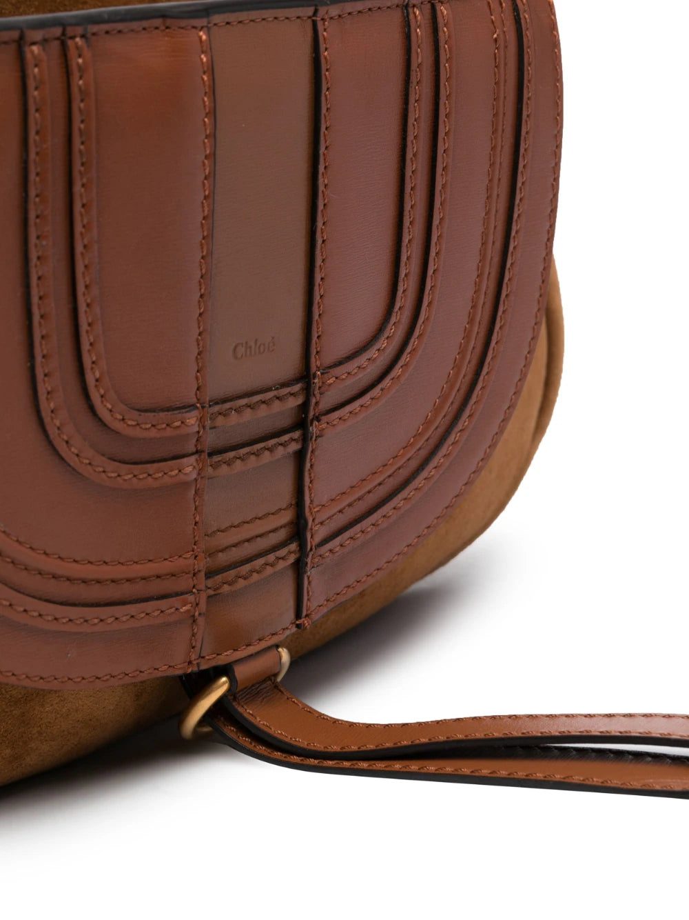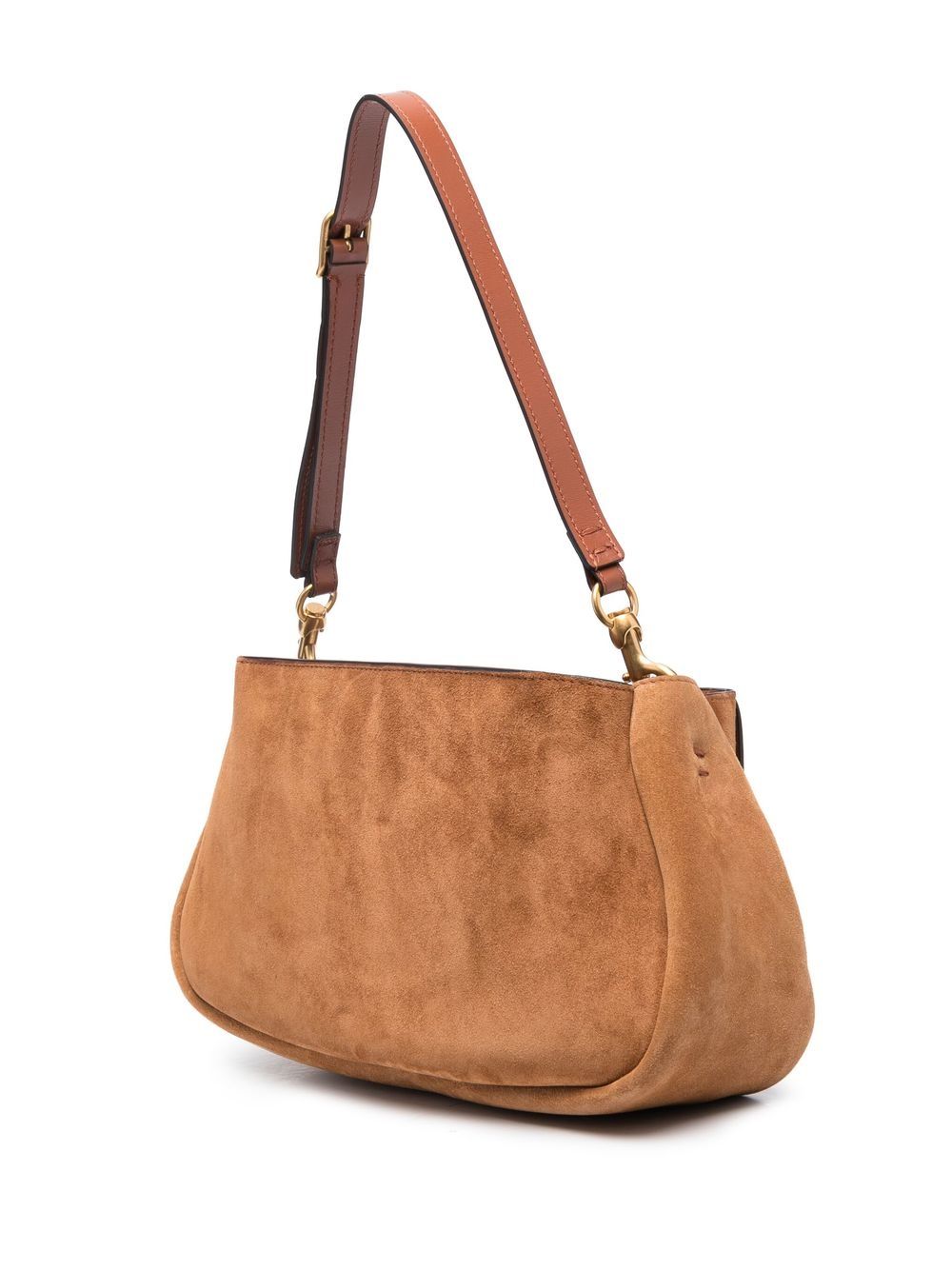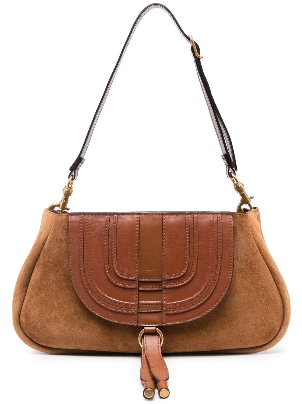 Marcie suede shoulder bag from CHLOÉ featuring caramel brown, calf suede, foldover top, debossed detailing, embossed logo to the front, top zip fastening and long top handle.