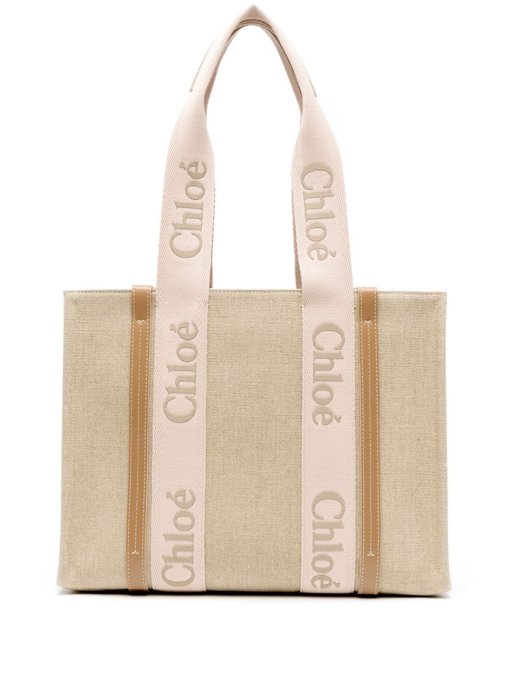 Decorated with signature Woody ribbon trimming, this beige CHLOÉ tote is crafted in Italy from interwoven linen and finished with smooth calf leather.