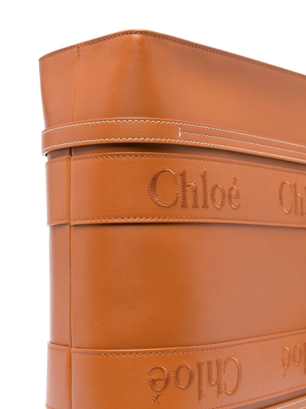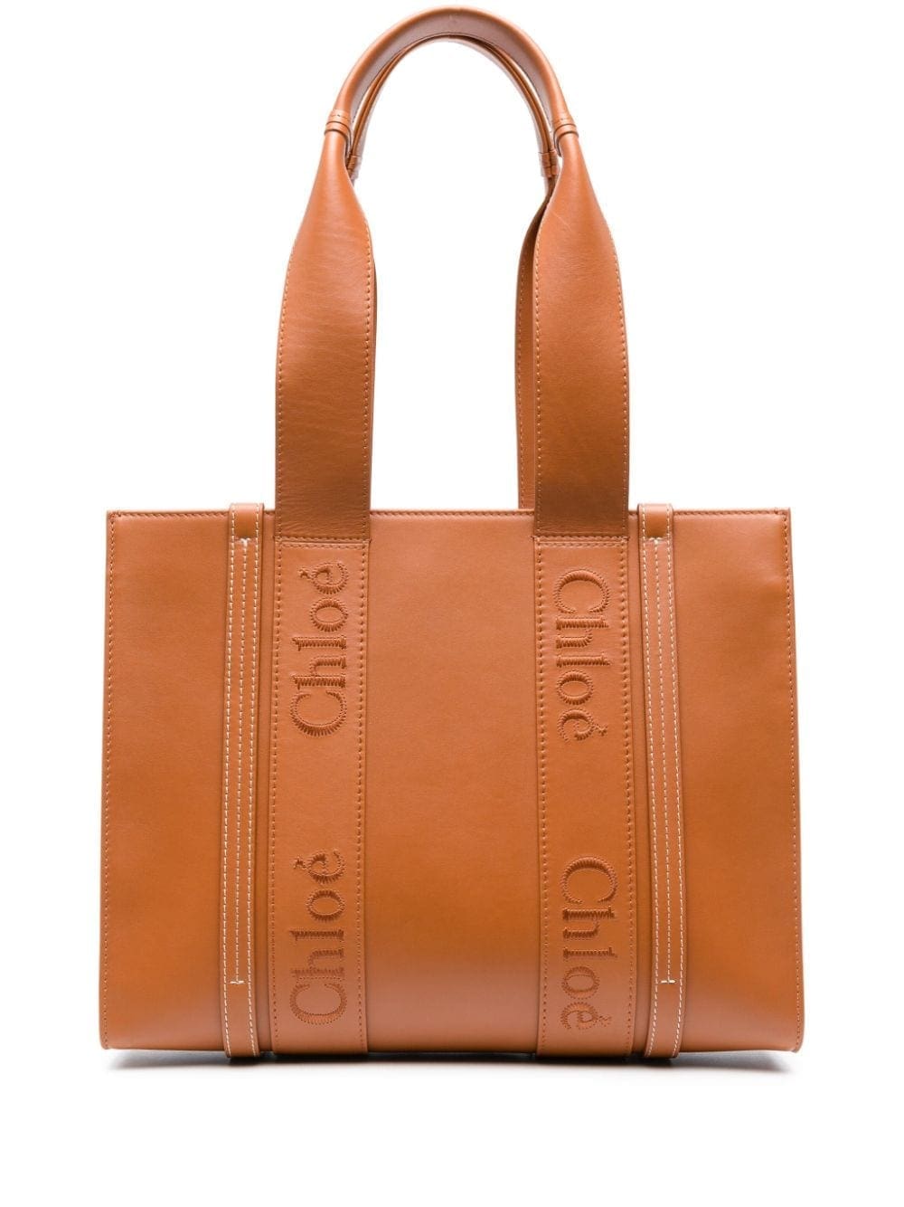 caramel brown calf leather linen/flax two long top handles embroidered logo main compartment internal slip pocket internal logo patch