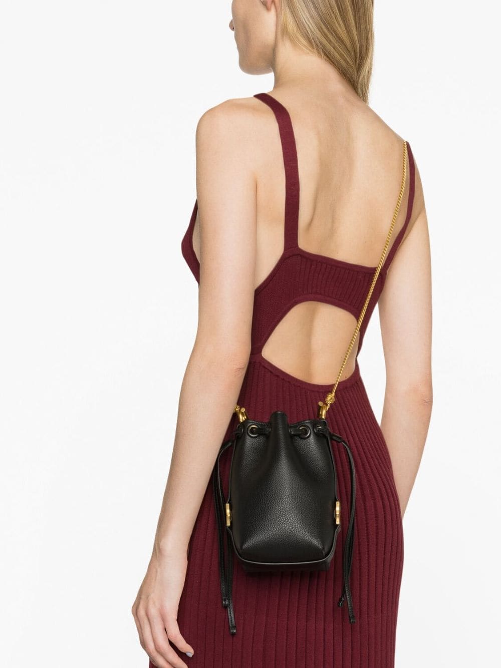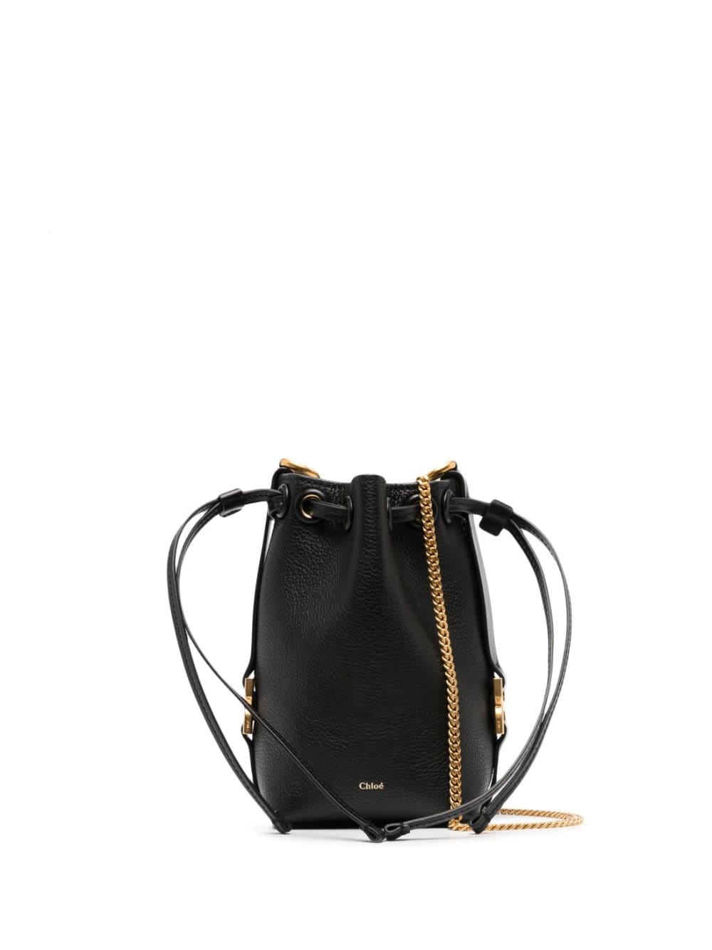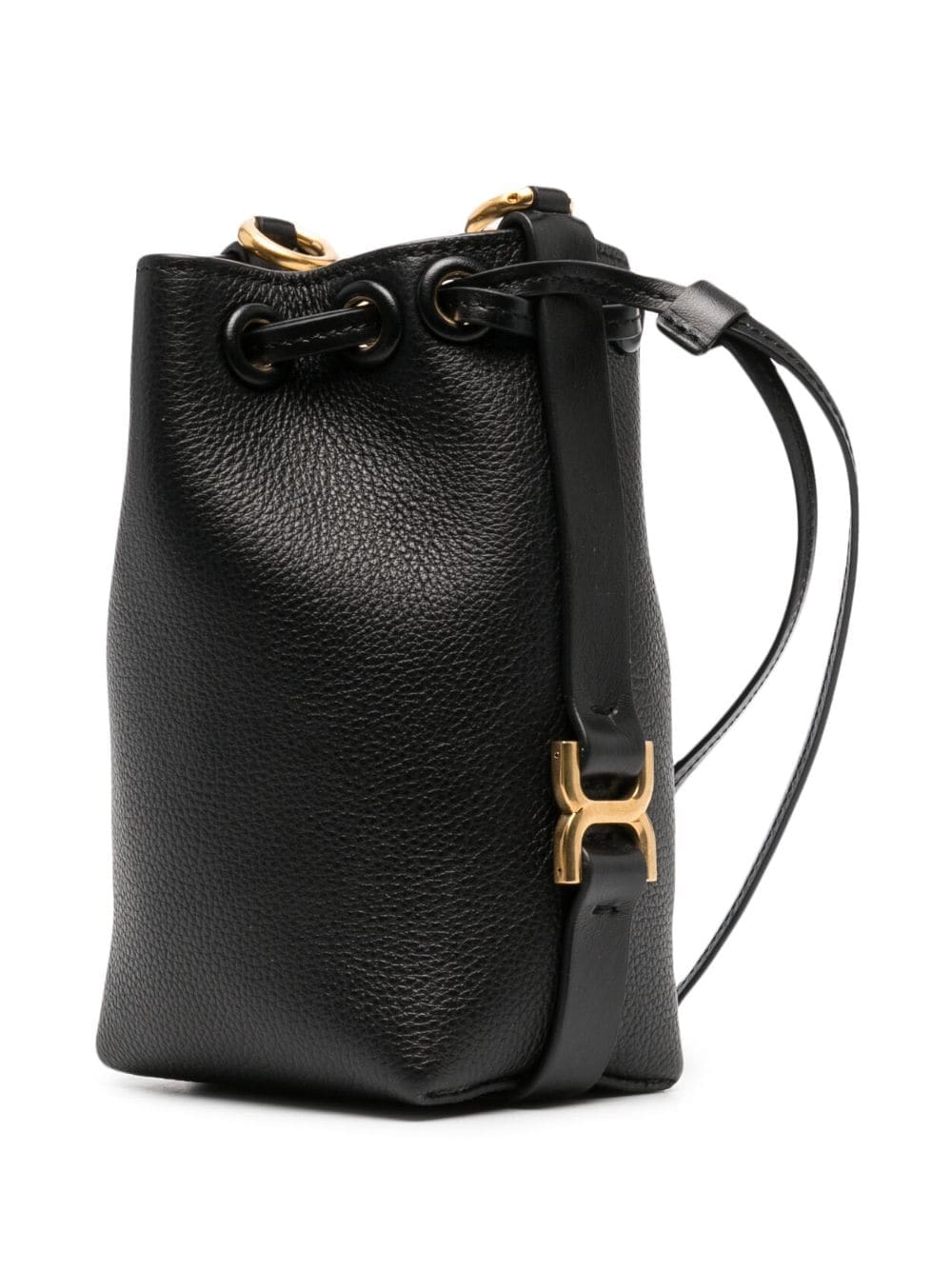 Chloé expands its iconic Marcie lineup with the introduction of this bucket bag version. Crafted from grained calf leather, it boasts leather belts at the sides that are embellished with gold-tone hardware, echoing the '70s folk inspiration of the original. Knot detailing on the chain-link shoulder strap and a logo stamp to the front add the finishing touch.