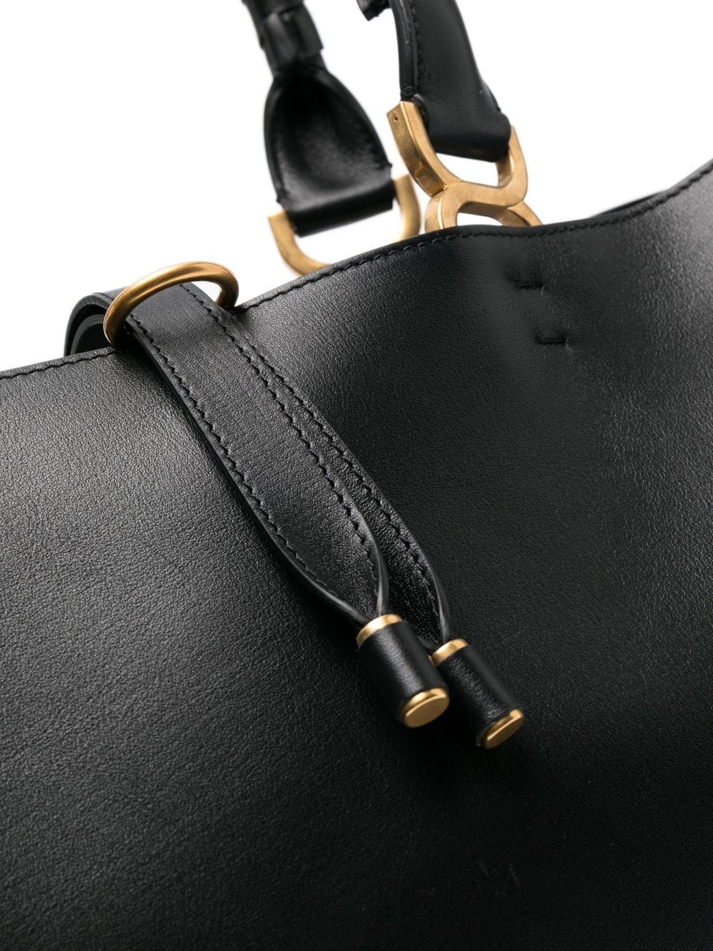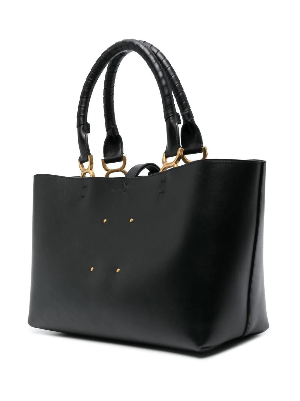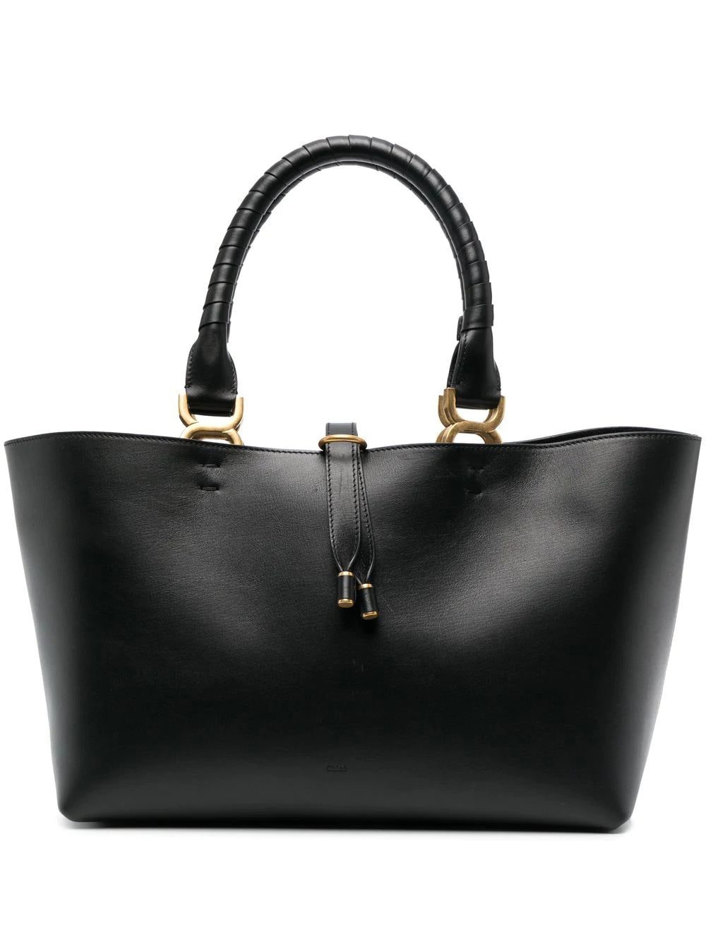 rolled-handles leather tote bag from CHLOÉ featuring black, calf leather, polished finish, gold-tone hardware, strap fastening, open top, main compartment and two rolled top handles.