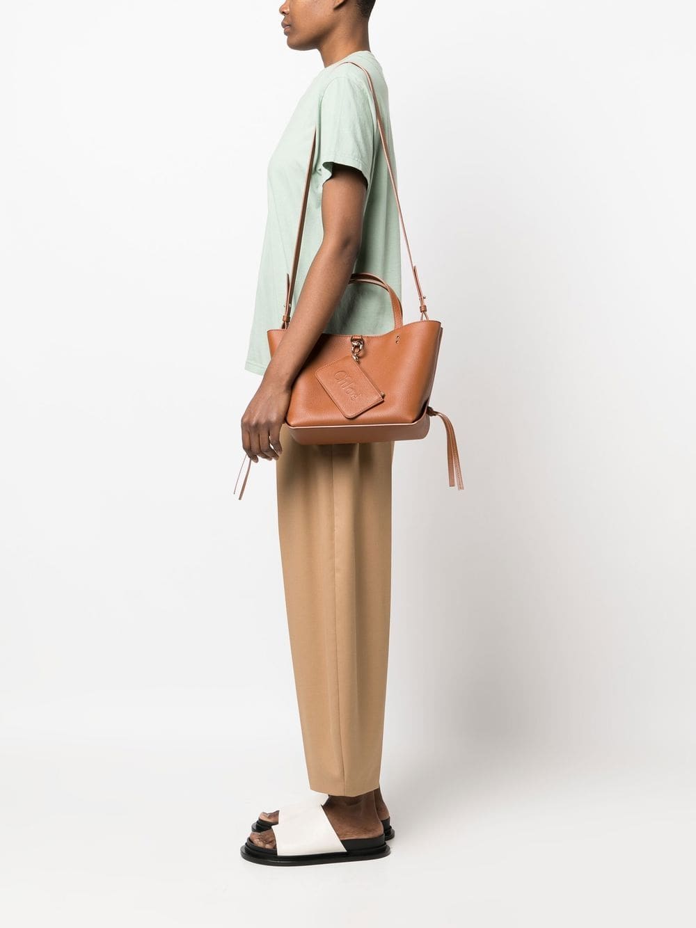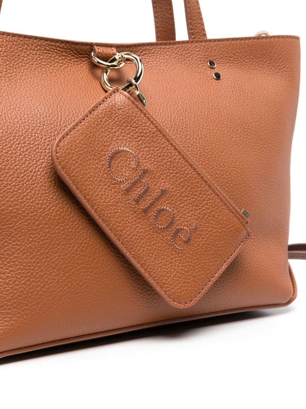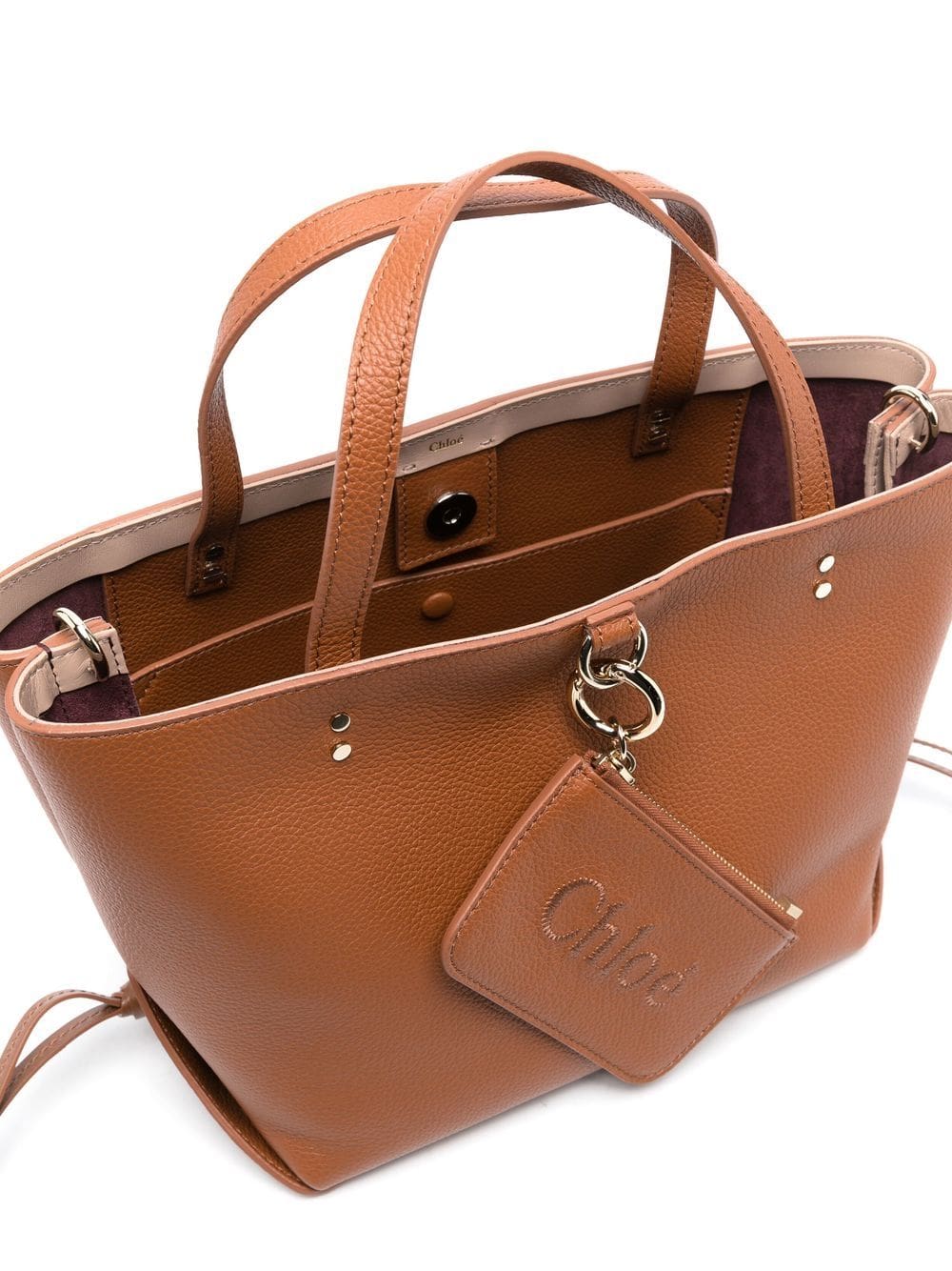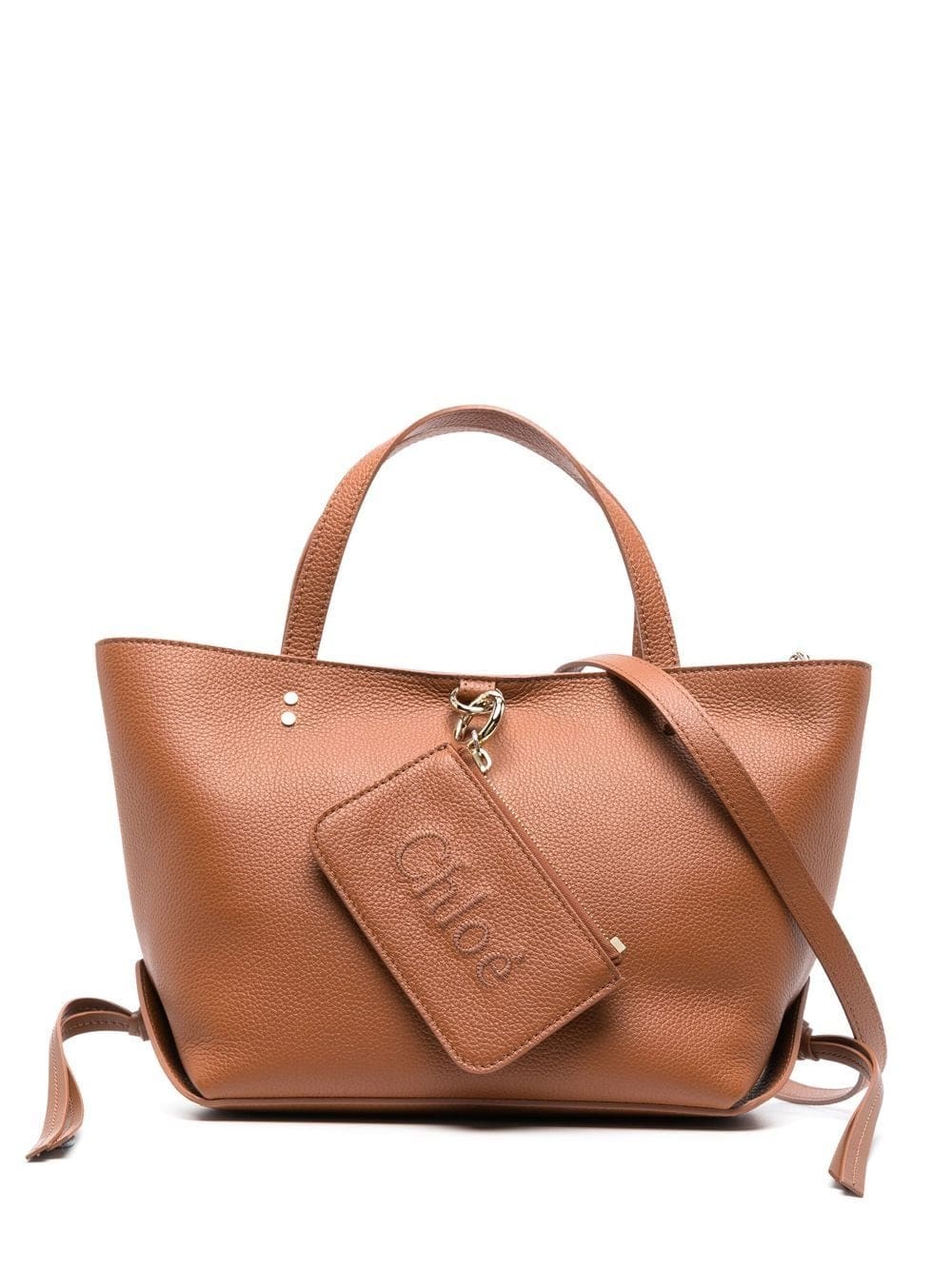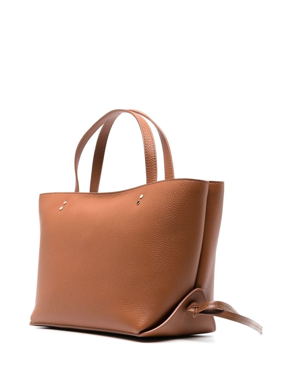tan brown calf leather grained texture gold-tone hardware tie detailing concealed magnetic fastening two top handles logo-embossed external zip pocket main compartment internal stud-fastening pocket