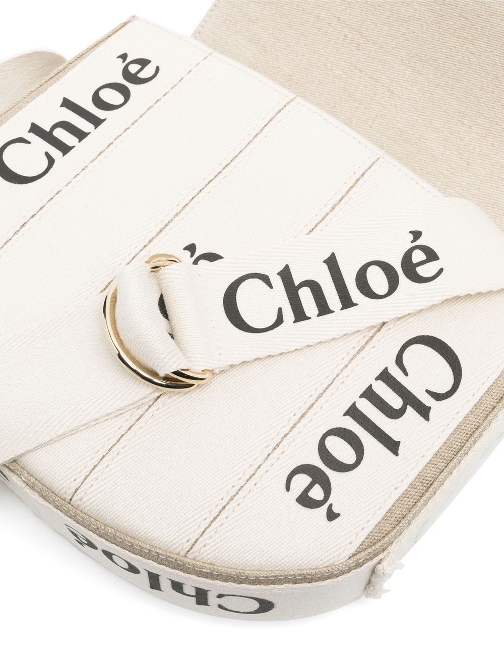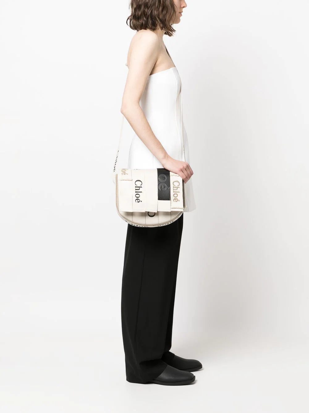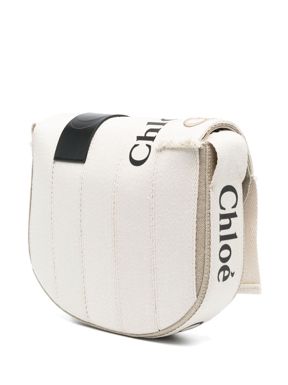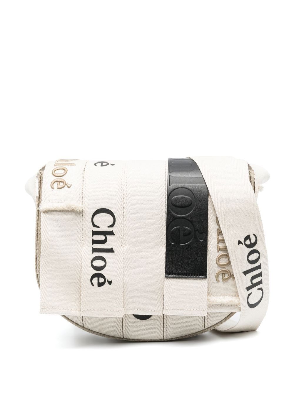 Woody logo-detail saddle bag from CHLOÉ featuring embossed logo to the front, foldover top, internal zip-fastening pocket, logo shoulder strap, white/black, linen, calf leather and logo-print strap.