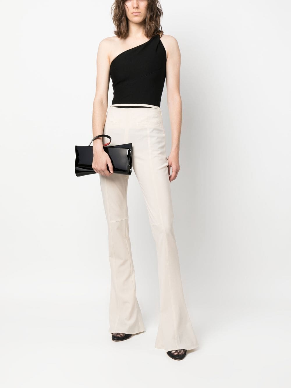 black calf leather asymmetric design patent finish top zip fastening single flat side handle main compartment