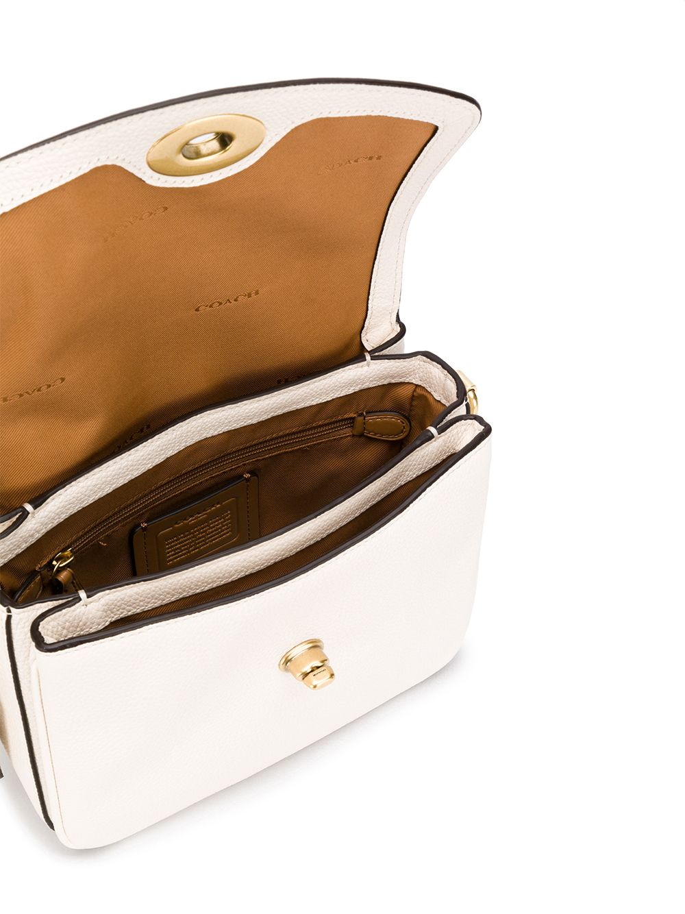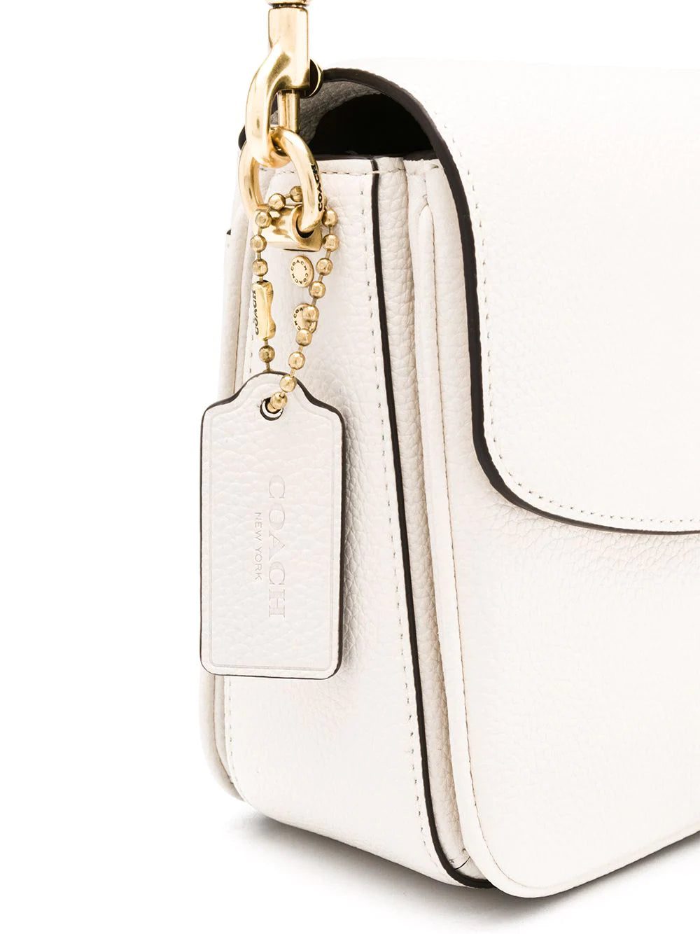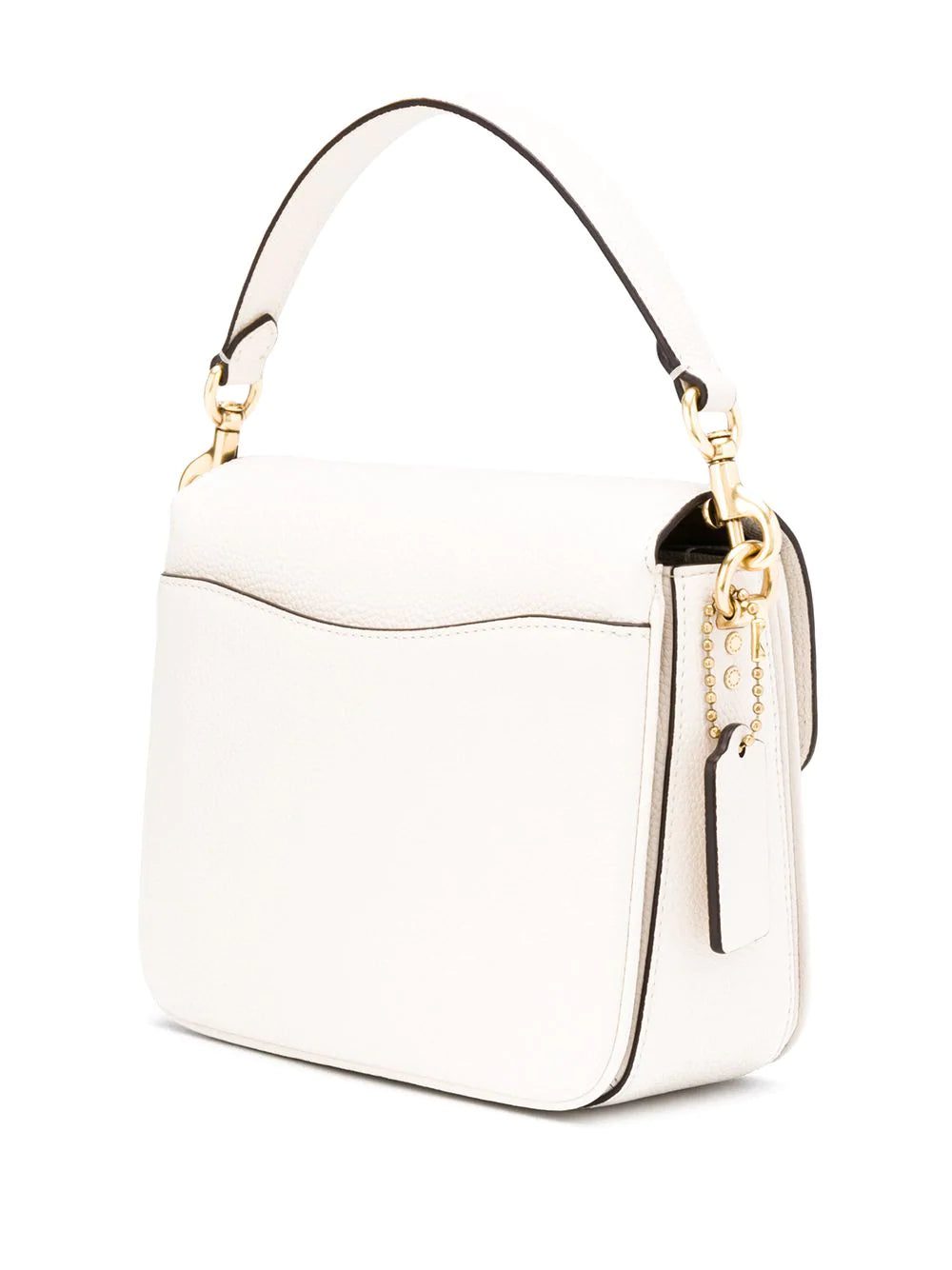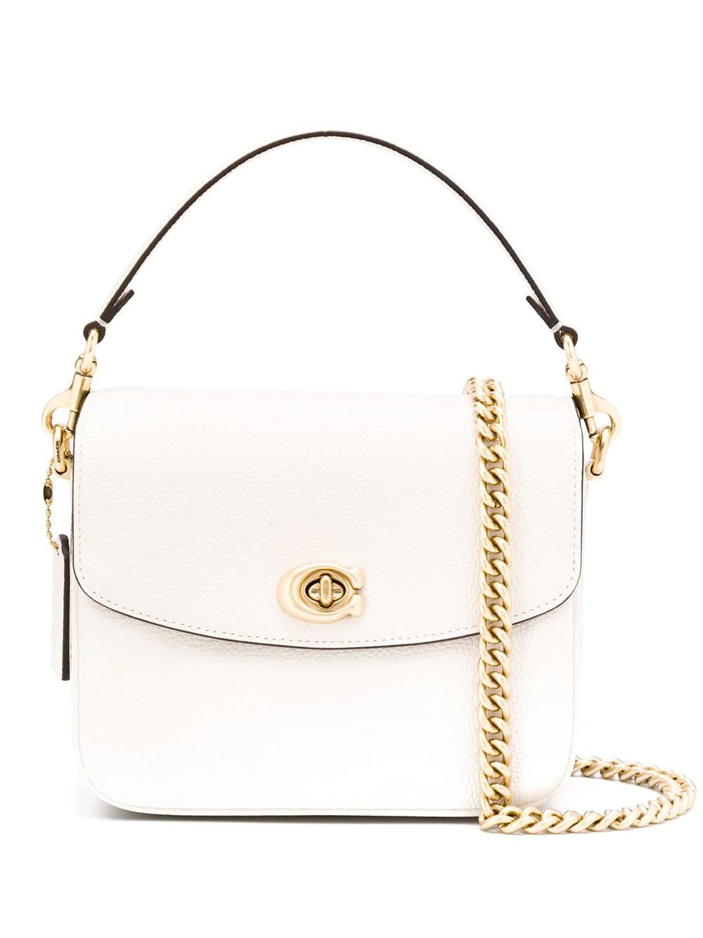 Chalk white calf leather Cassie 19 crossbody bag from Coach featuring gold-tone hardware, a flat top handle, foldover top with twist-lock closure, chain and leather straps, a front slip pocket, a main internal compartment and an internal zipped pocket.