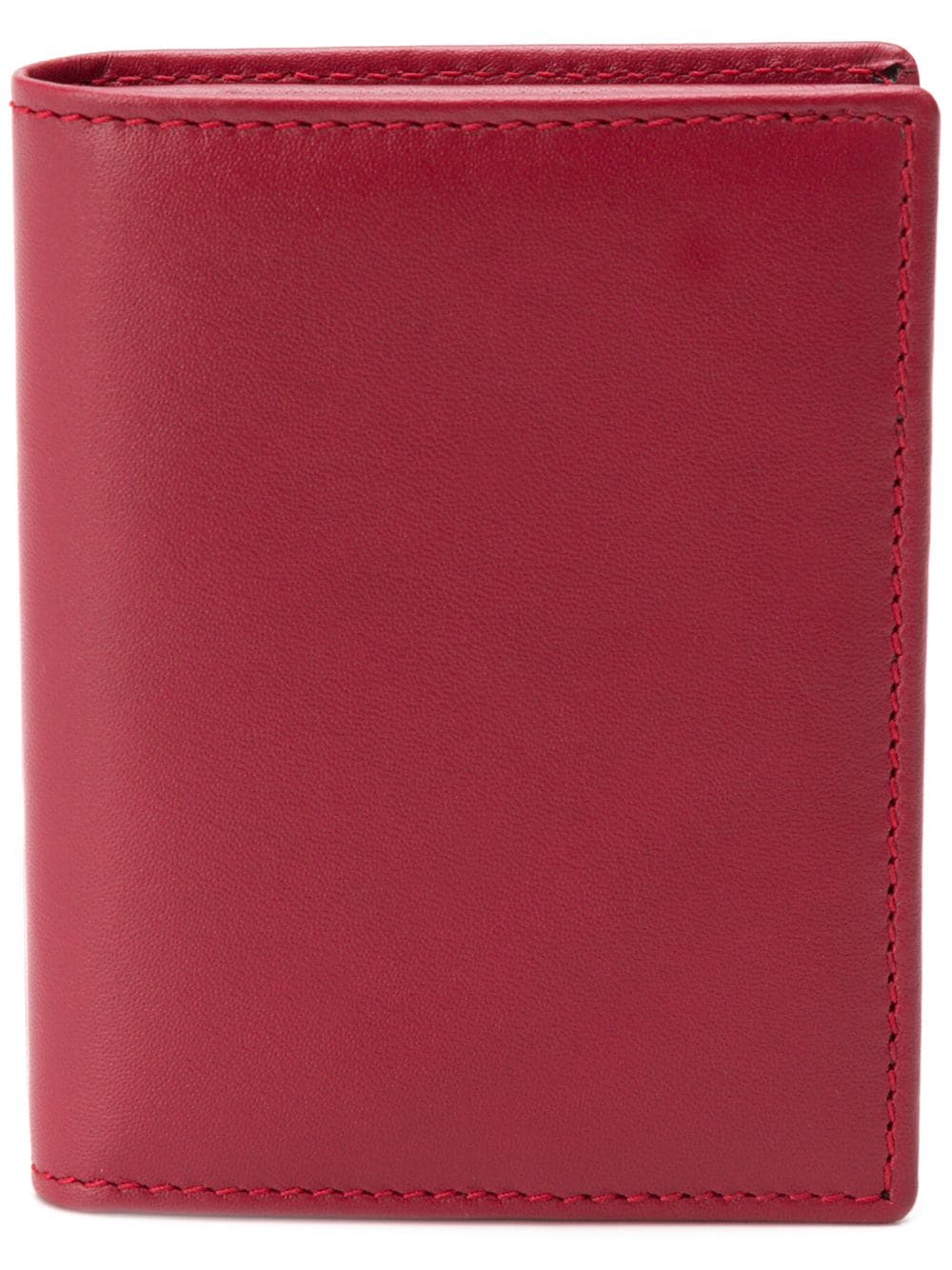 Red leather card holder from Comme Des Garçons Wallet featuring a rectangular body, an internal logo stamp, four card slots, a coin pocket and an internal slip pocket.