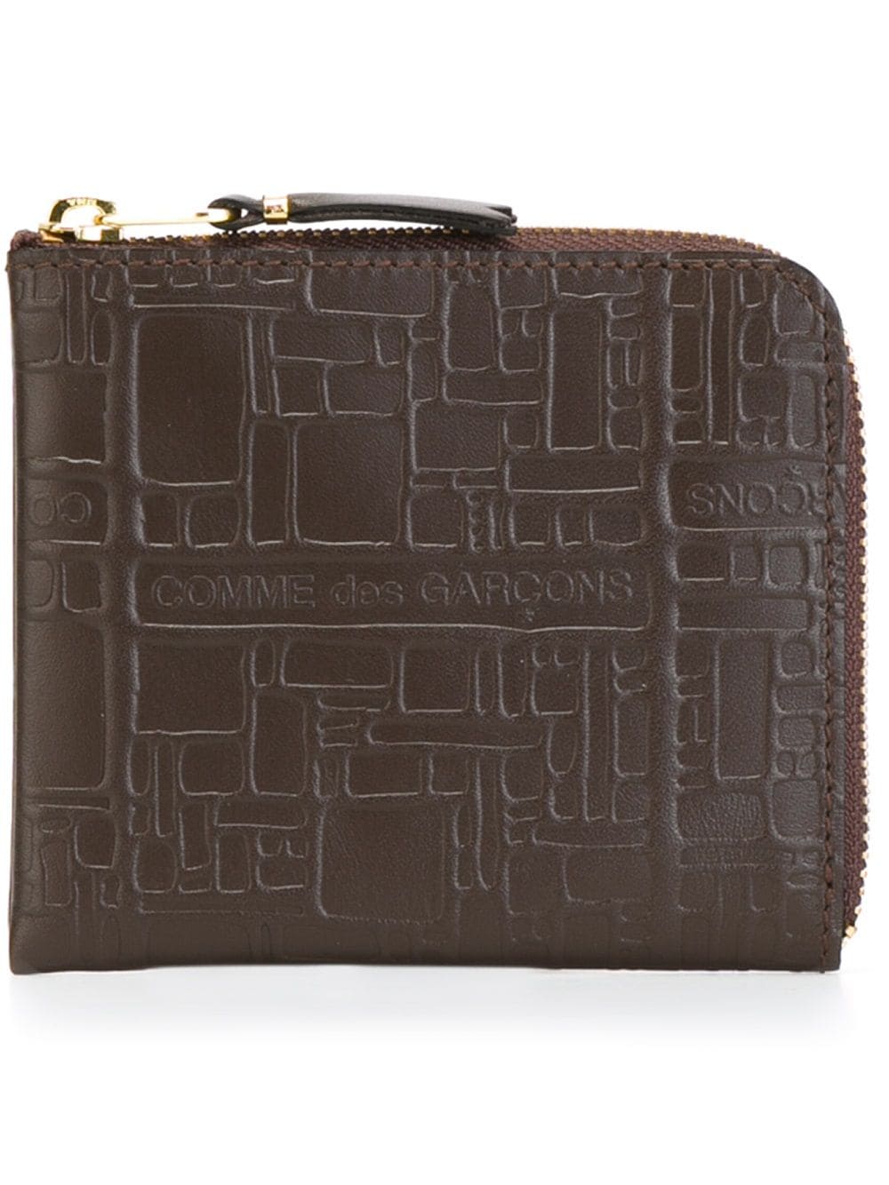 Brown calf leather 'Embossed Logo' wallet from Comme Des Garçons Wallet featuring an all around zip fastening. This item is unisex.