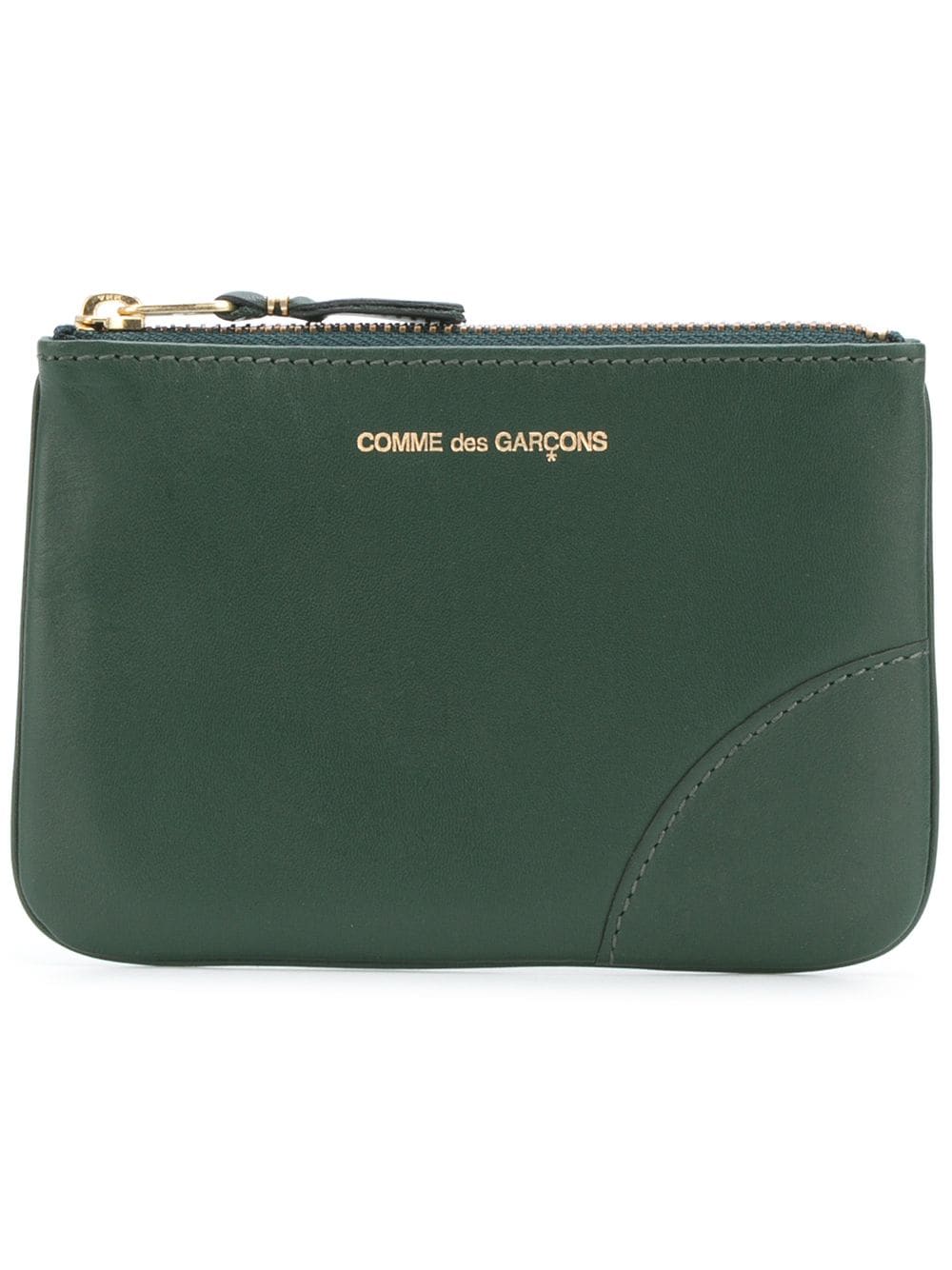 Bottle green calf leather logo-print zipped wallet from Comme Des Garçons Wallet featuring a printed logo, stitching details, a gold-tone top zip fastening and a main internal compartment.
