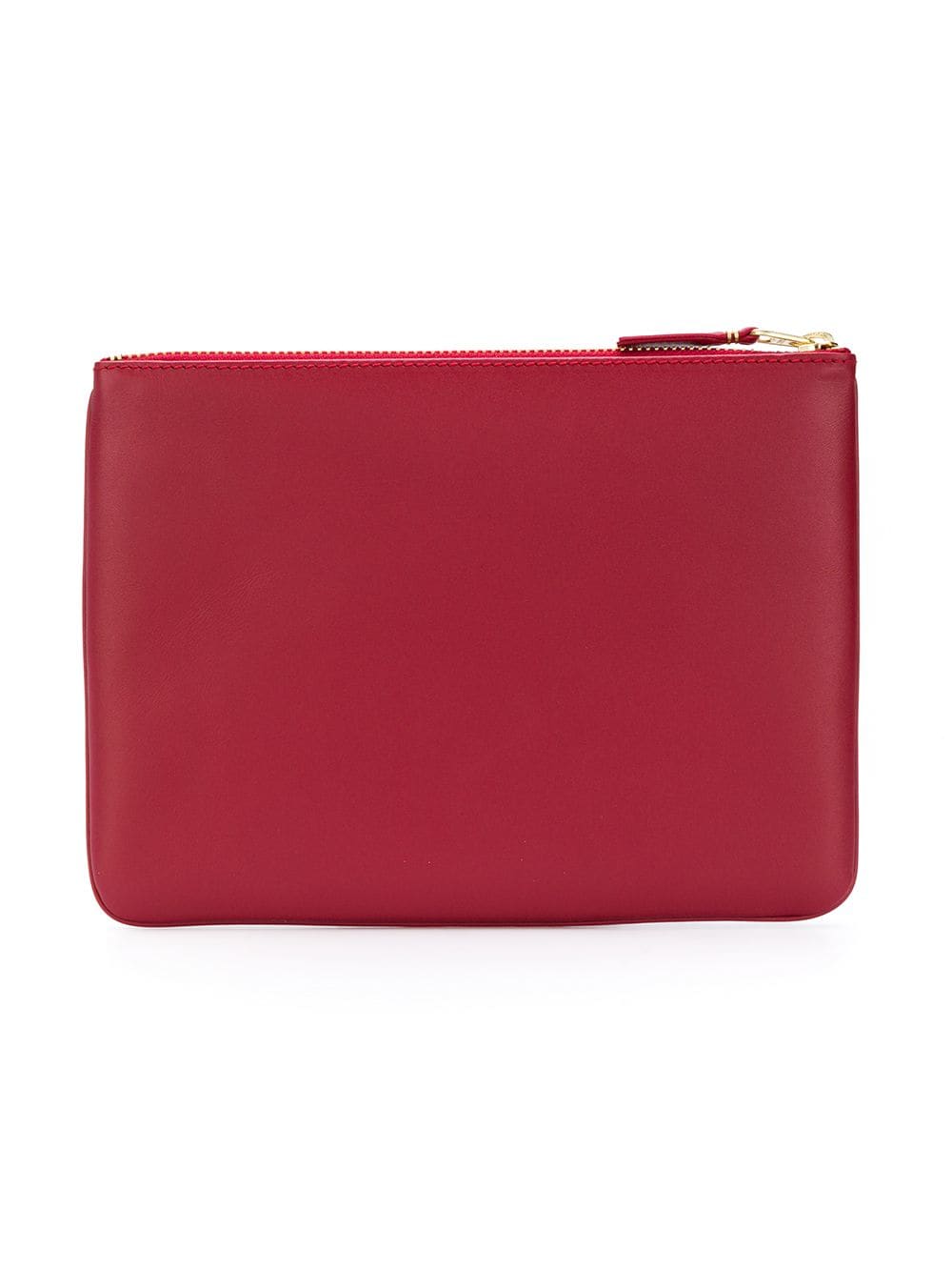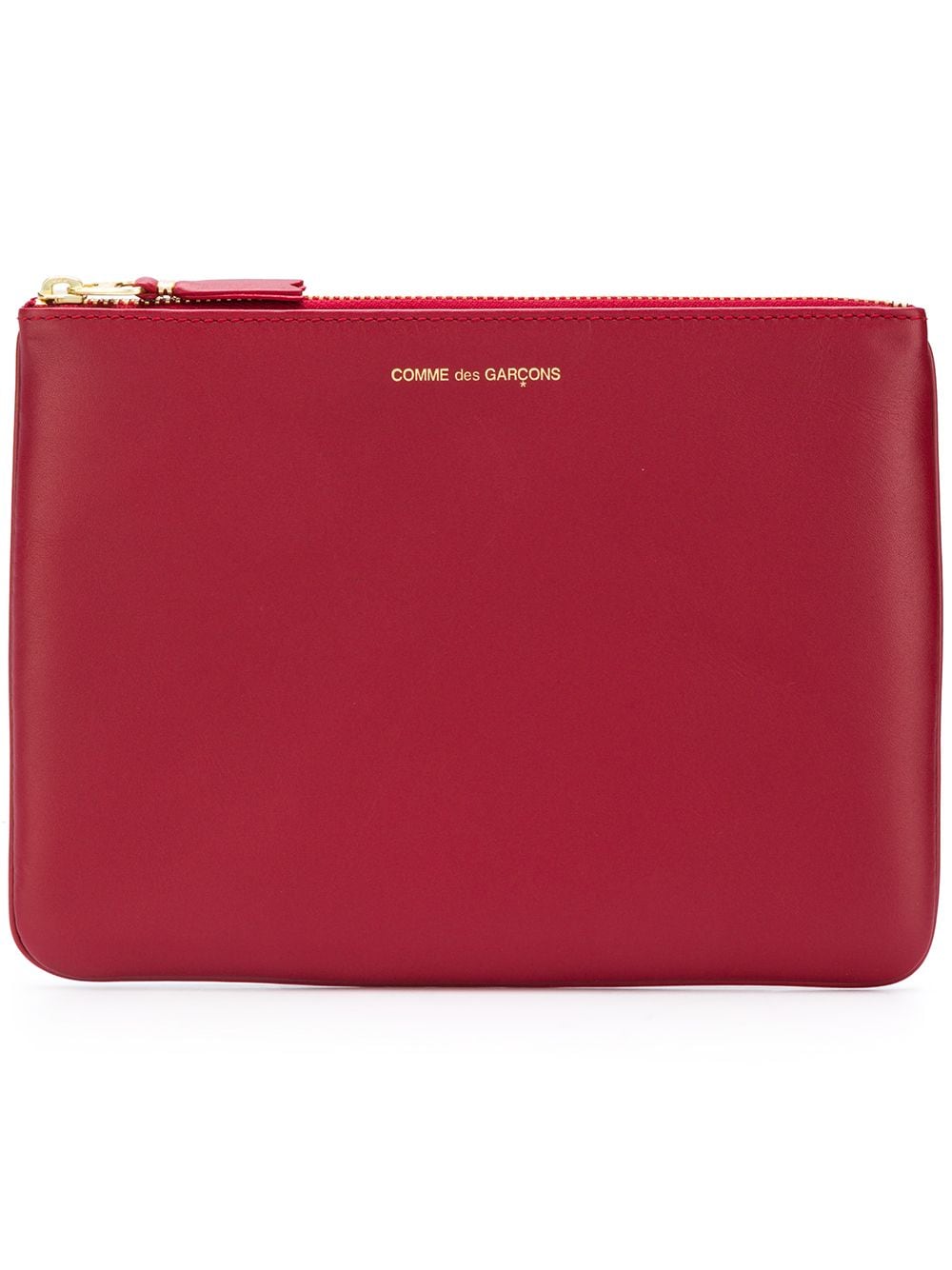Red leather top zip wallet from Comme Des Garçons Wallet featuring a rectangular body, a gold-tone printed logo to the front, a gold-tone top zip fastening and a main internal compartment. This item is unisex.