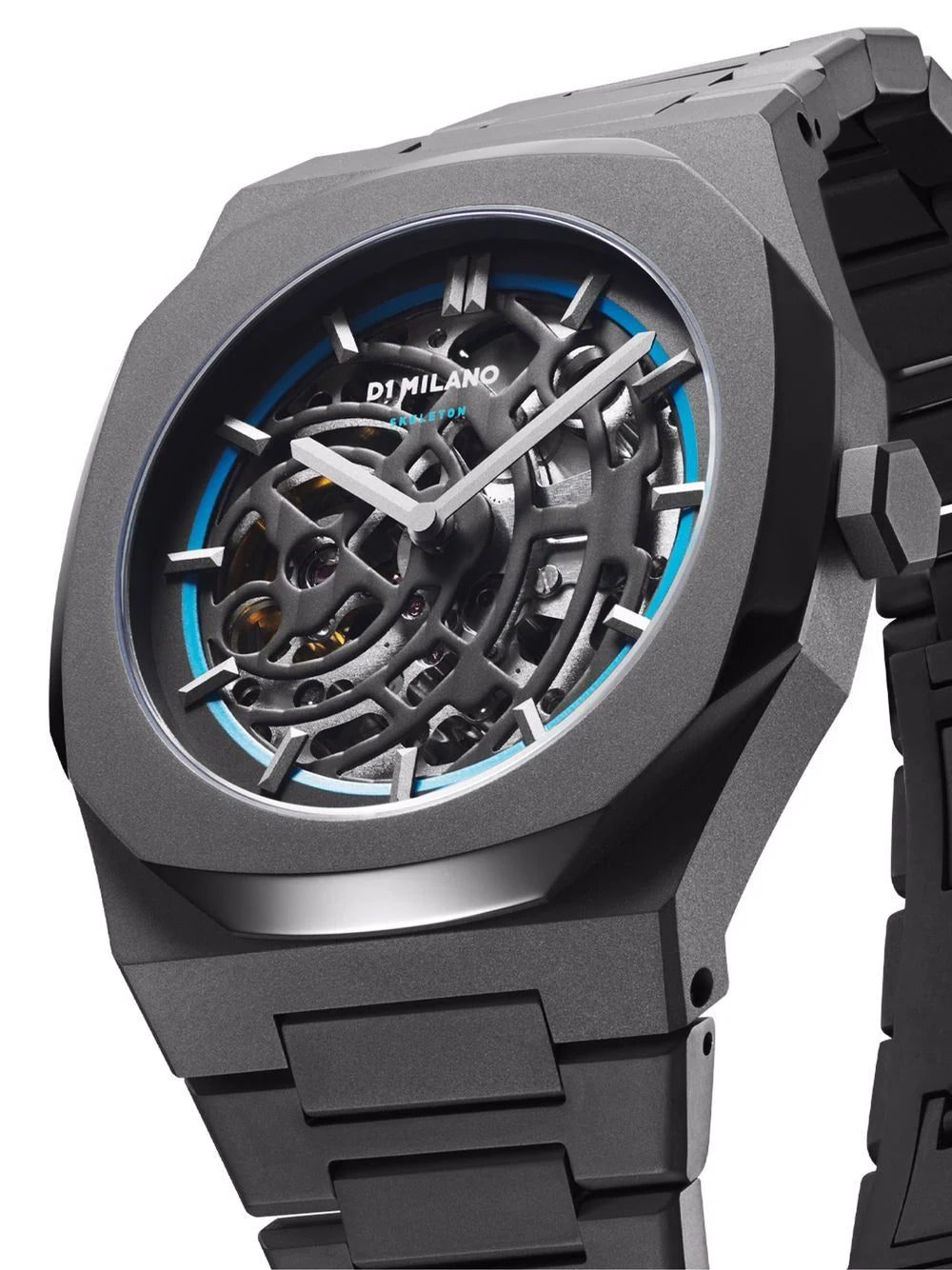 Founded in Milan in 2013, D1 Milano has grown to become a leader in contemporary timepieces with a keen eye towards technical watchmaking know-how. A fine example is this Skeleton Sandblast Blue 41.5mm which is powered by a mechanical movement Seiko SII NH70 to ensure precision at all times.