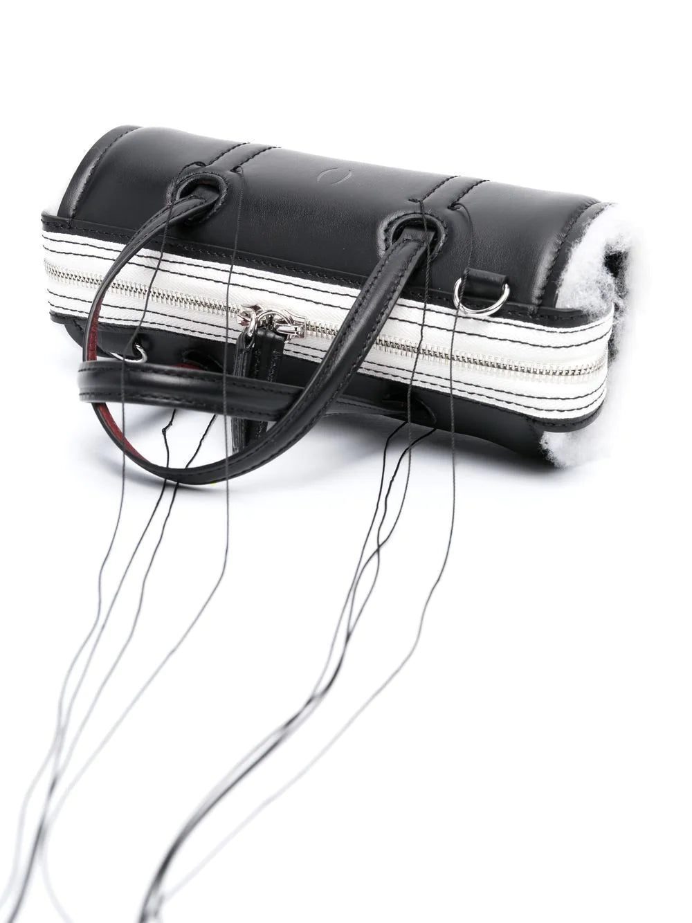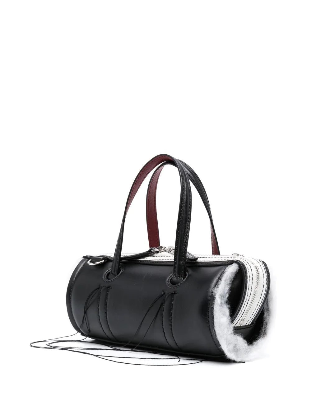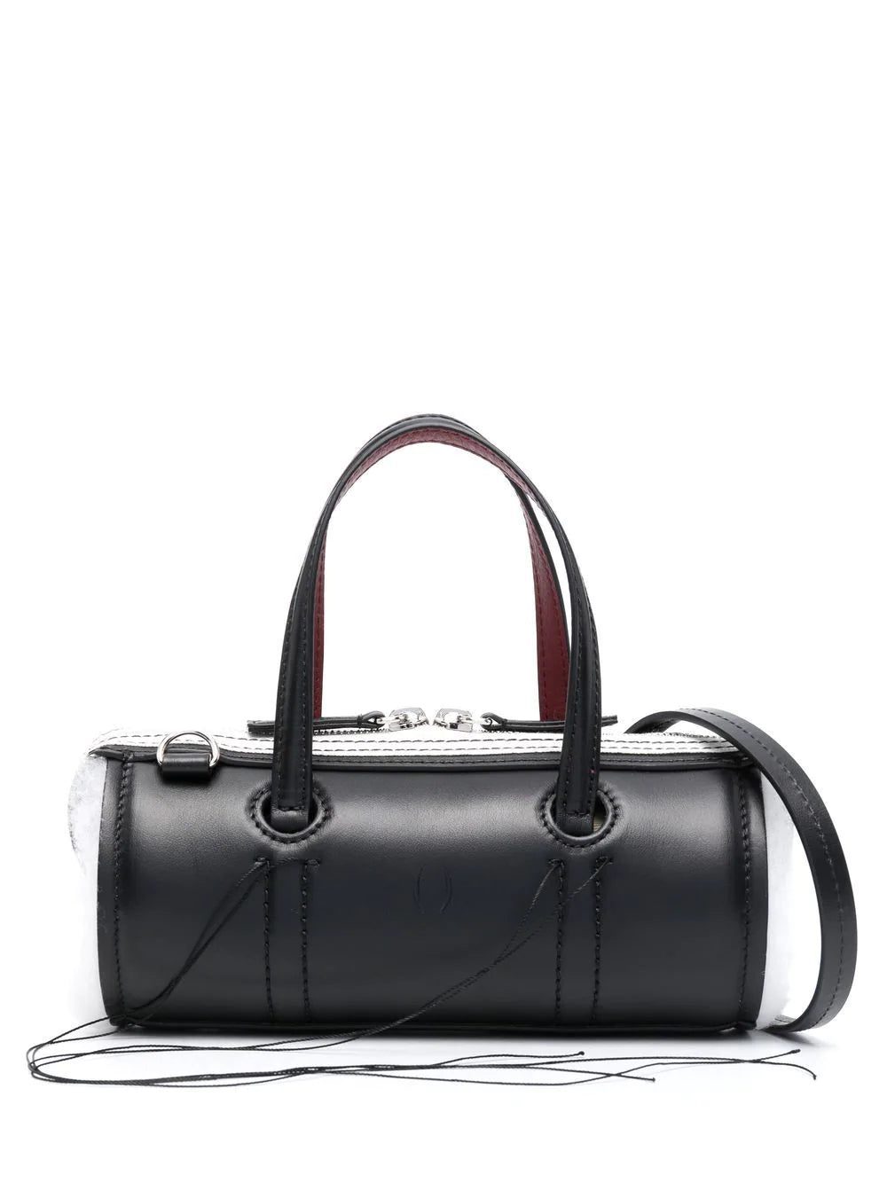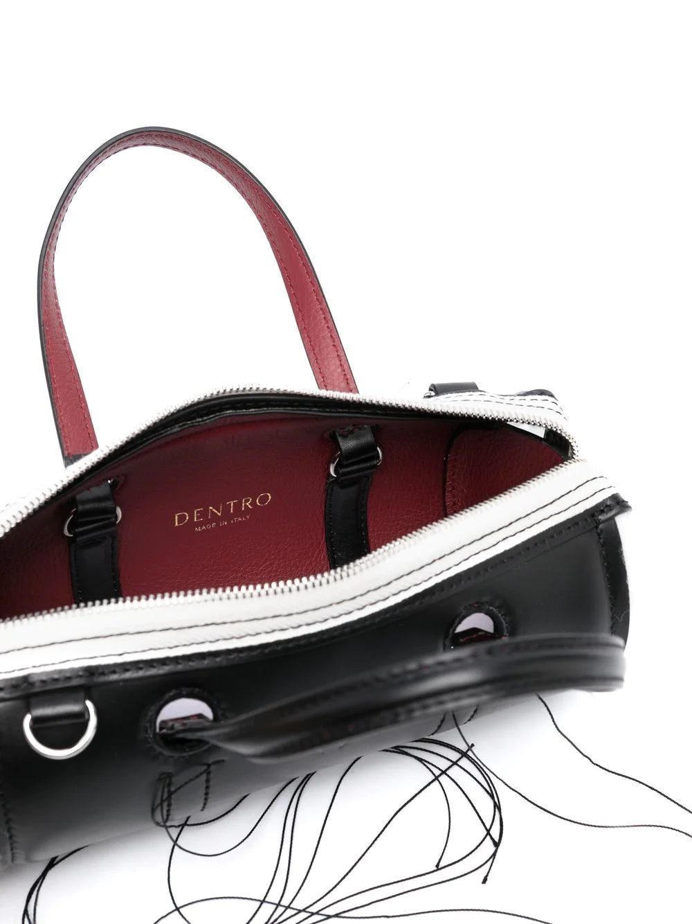 Anona leather crossbody bag from DENTRO featuring silver-tone hardware, exposed-seam detailing, two top handles, adjustable detachable shoulder strap, top zip fastening, main compartment, internal logo stamp, black/white and calf leather.