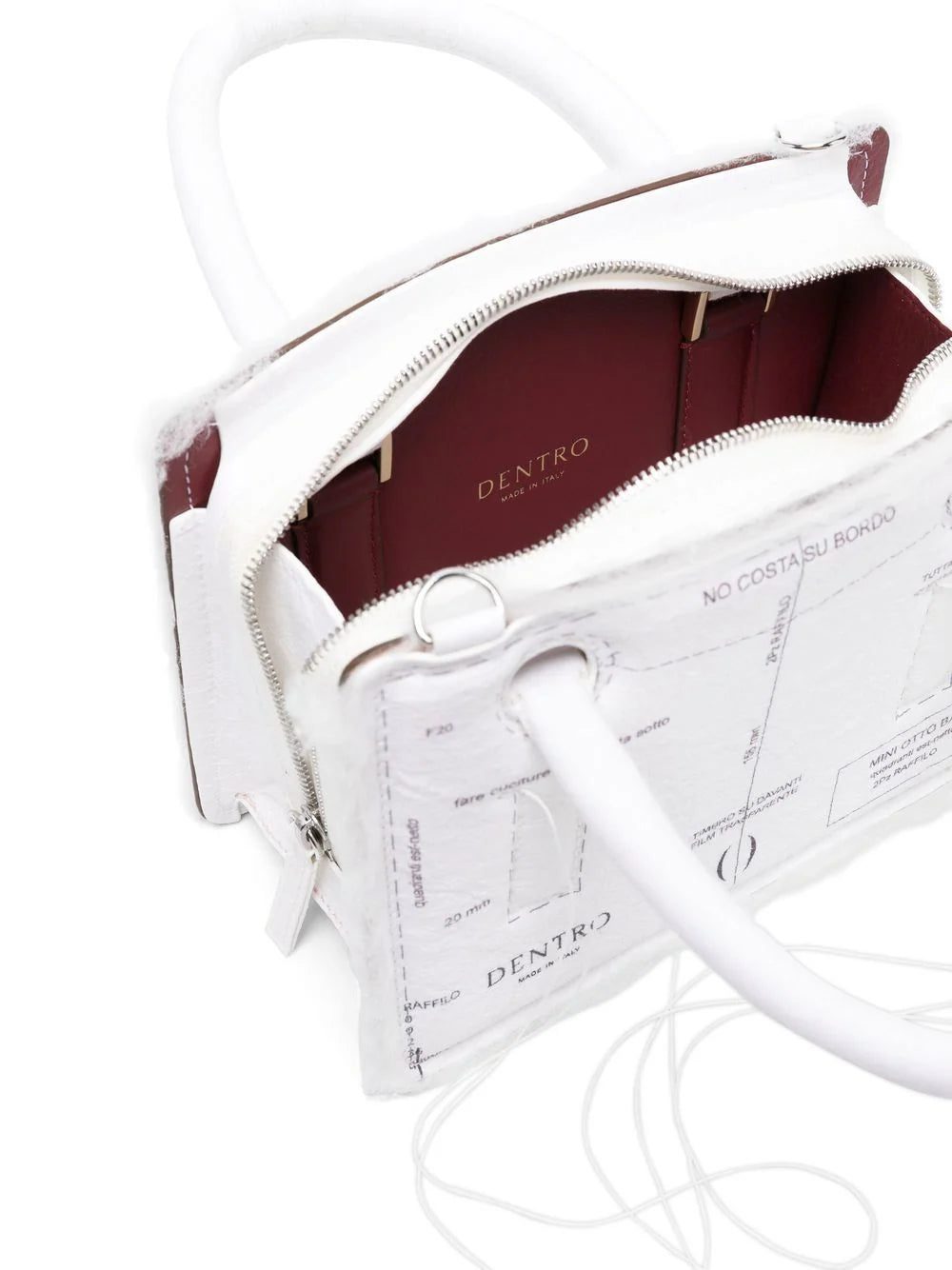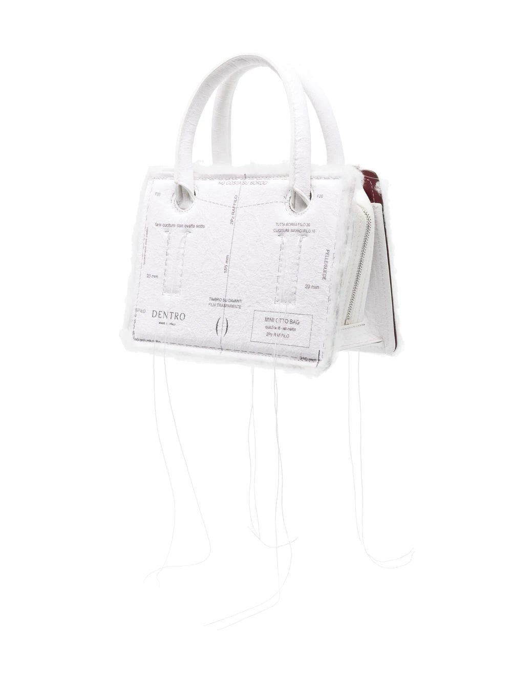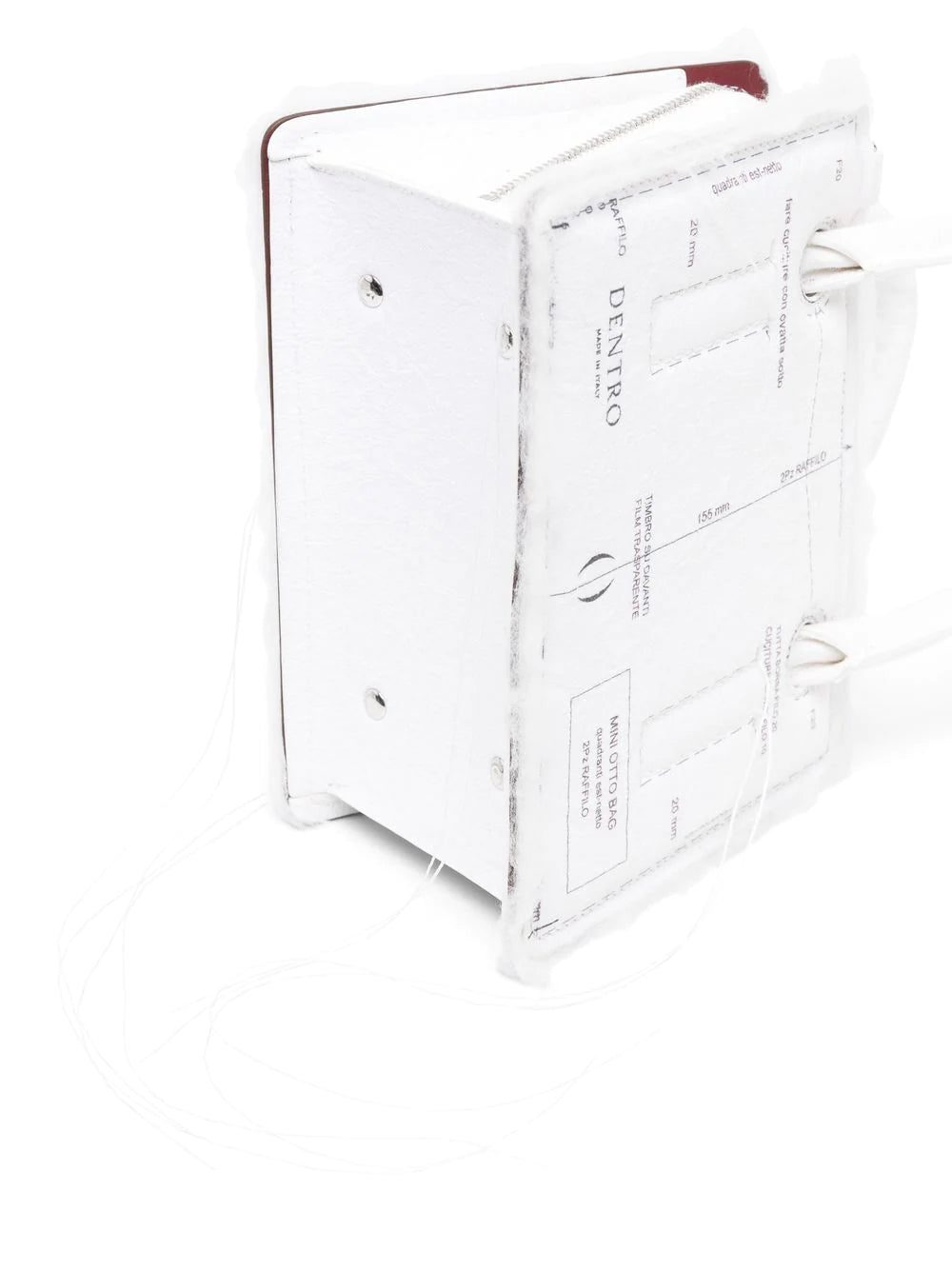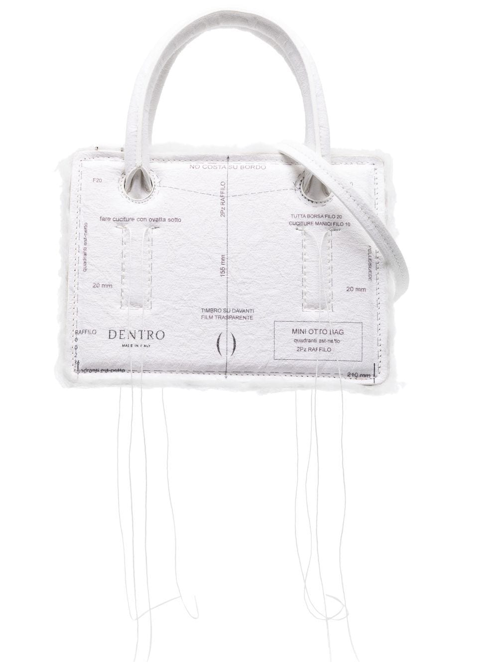 mini Otto crossbody bag from DENTRO featuring contrast stitching, deconstructed design, exposed-seam detailing, two top handles, adjustable detachable shoulder strap, top zip fastening, main compartment, internal logo stamp, white and calf leather.
