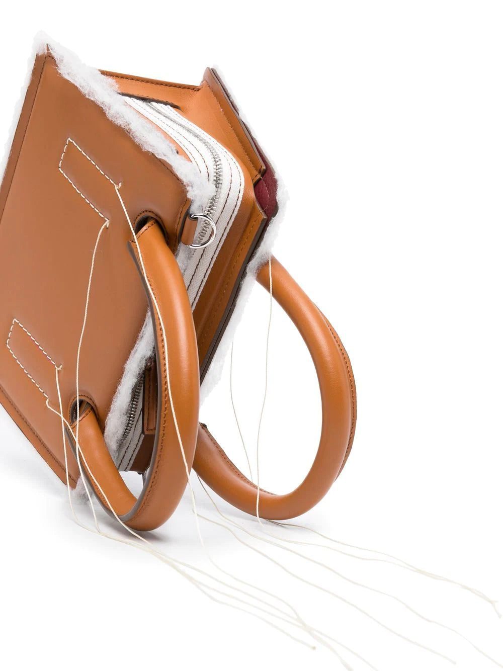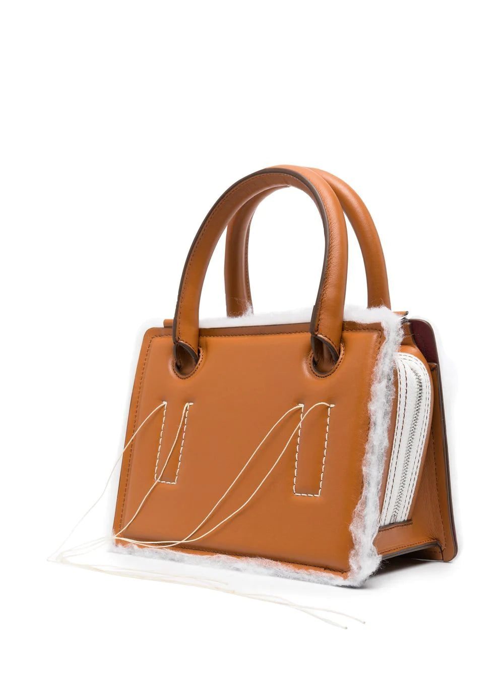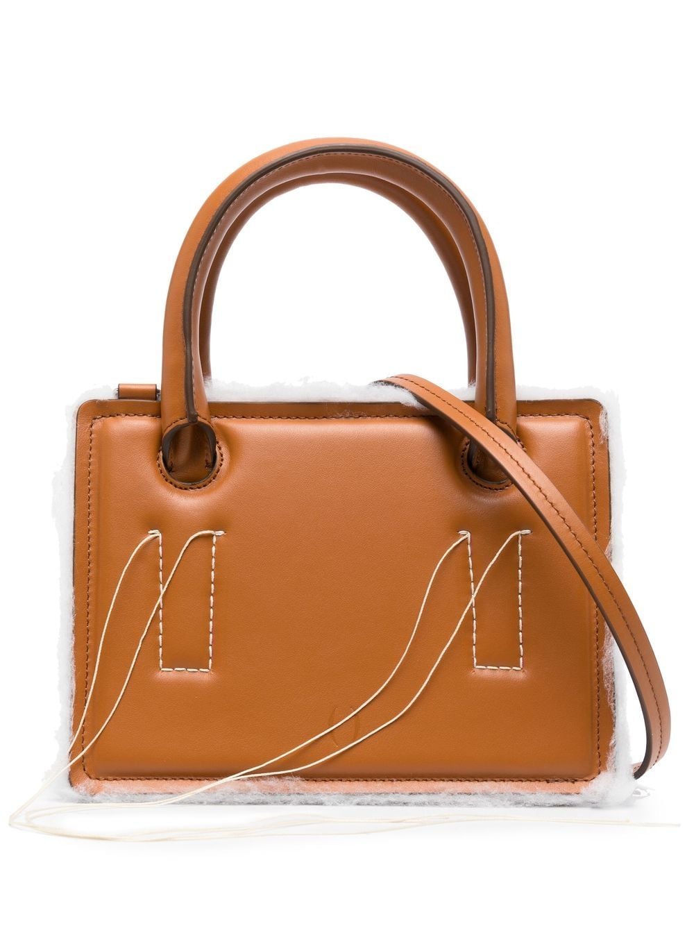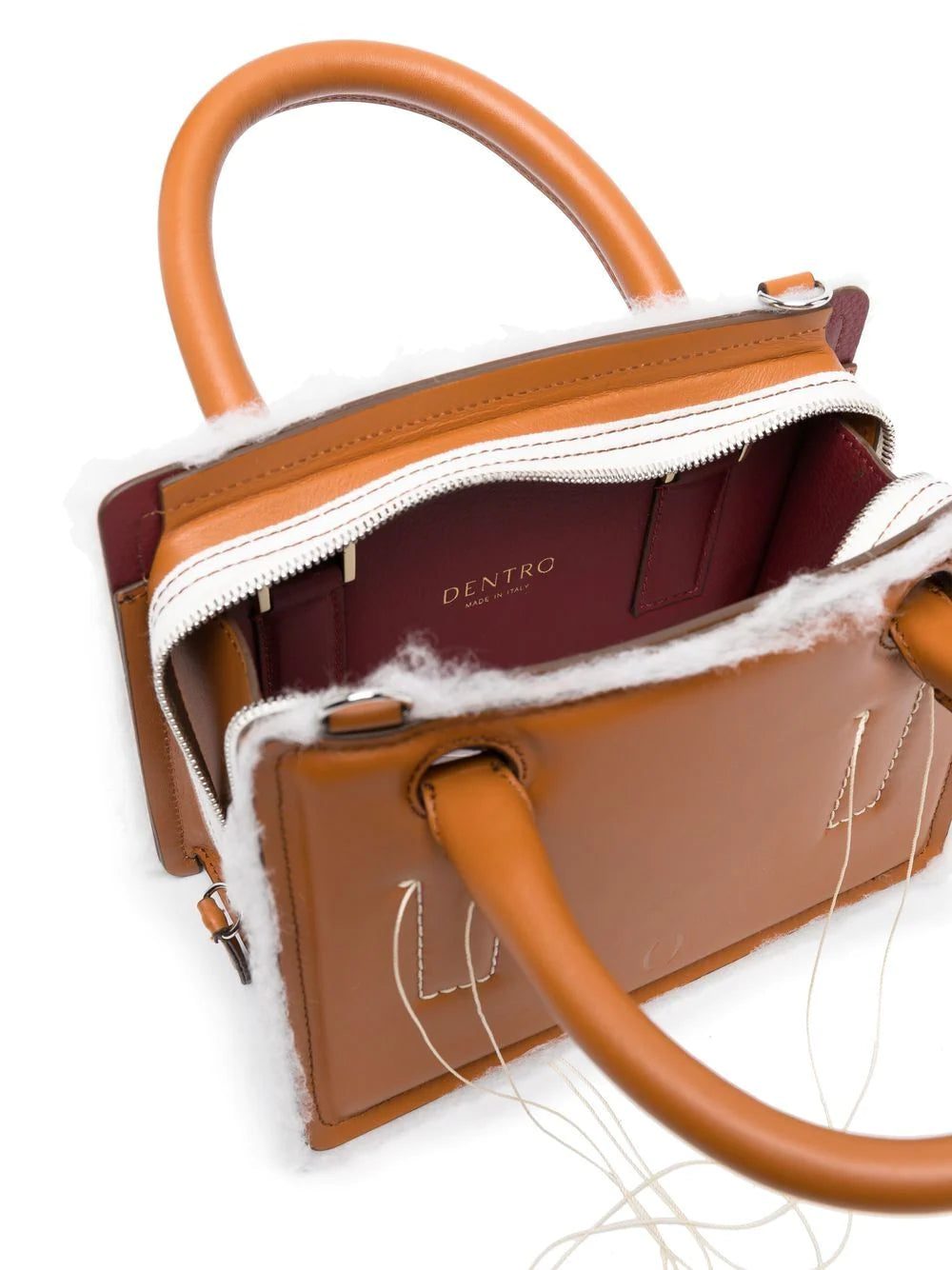 mini Otto crossbody bag from DENTRO featuring contrast stitching, exposed-seam detailing, two rolled top handles, adjustable detachable shoulder strap, top zip fastening, main compartment, internal logo stamp, brown and calf leather.
