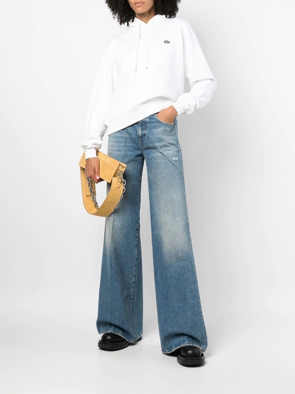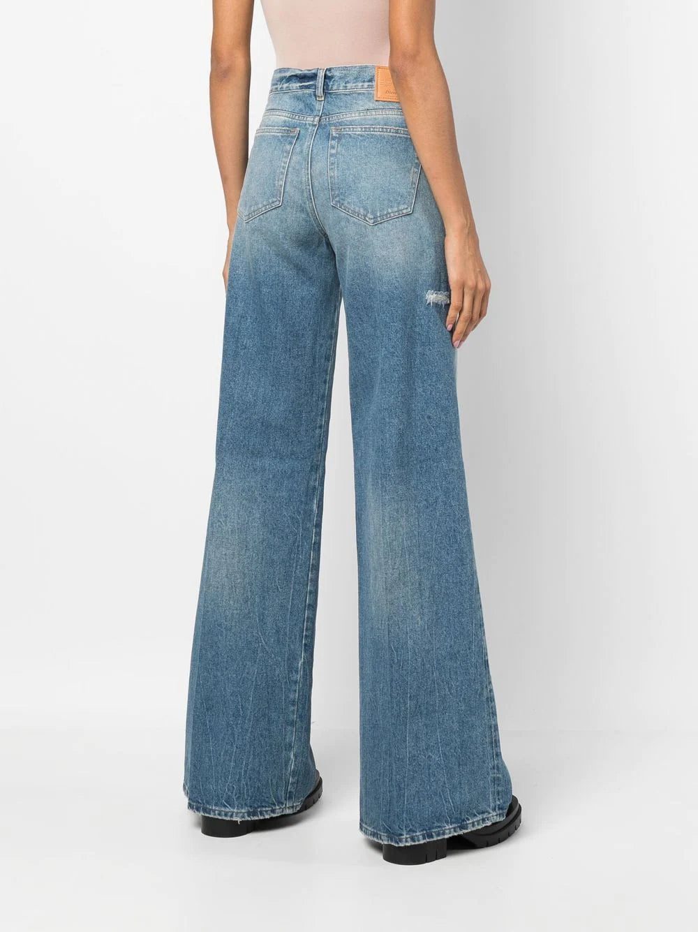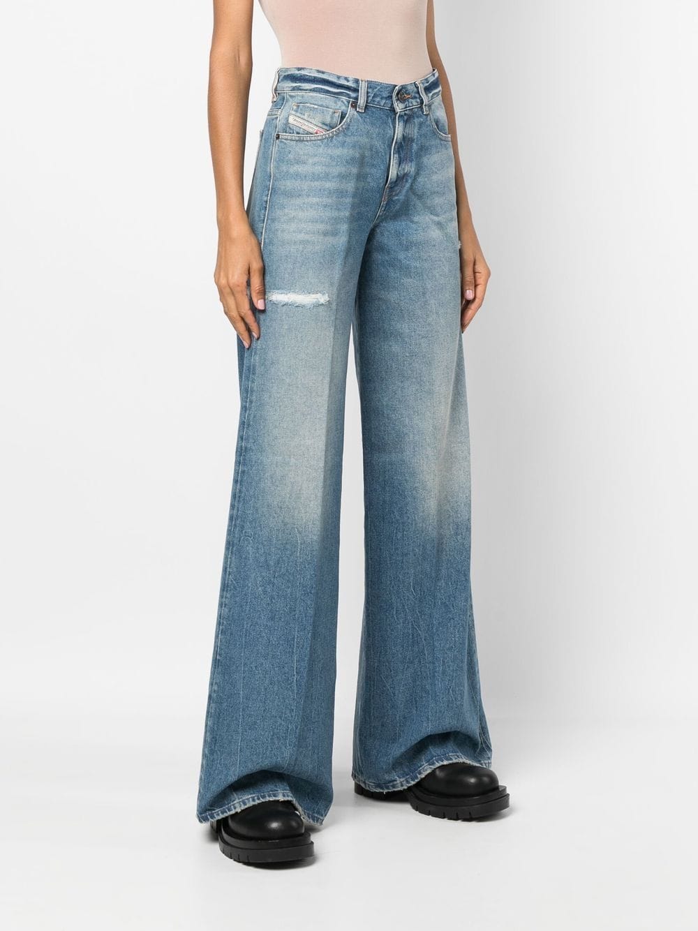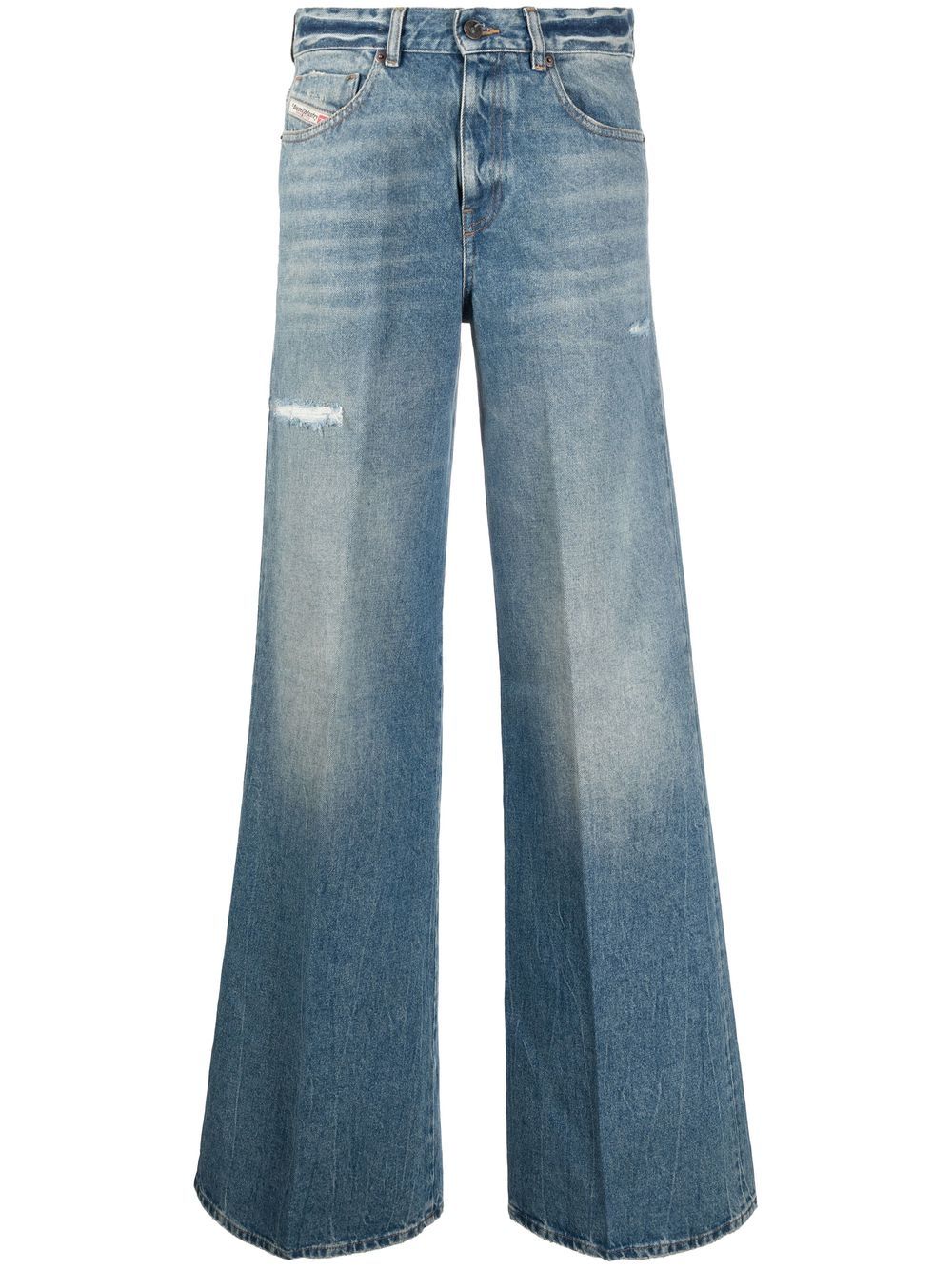 1978 flared denim jeans from DIESEL featuring cotton, blue, stonewashed, distressed effect, logo patch to the side, logo patch to the rear, high waist, belt loops, front button and zip fastening, classic five pockets and flared.