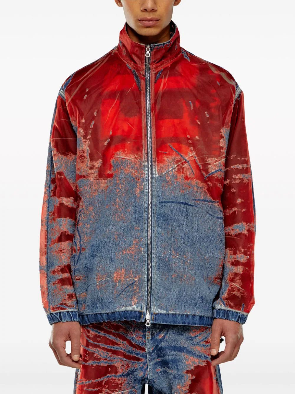 Diesel's experimental and unexpected approach to branding and craftsmanship results in pieces like this D-Krap jacket. It’s treated with a distressed red devoré wash that reveals the blue logo-print denim beneath.