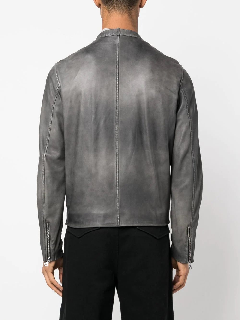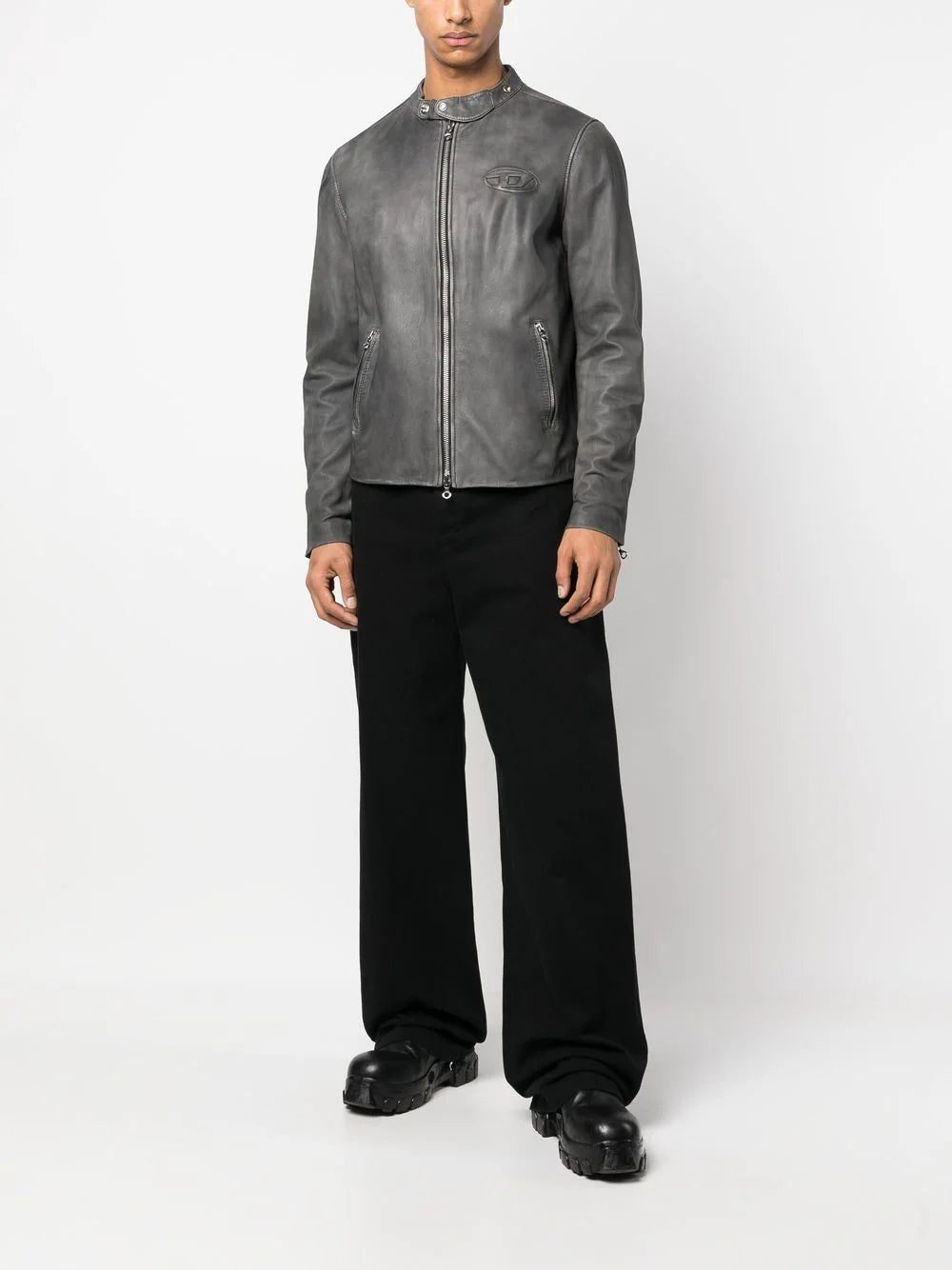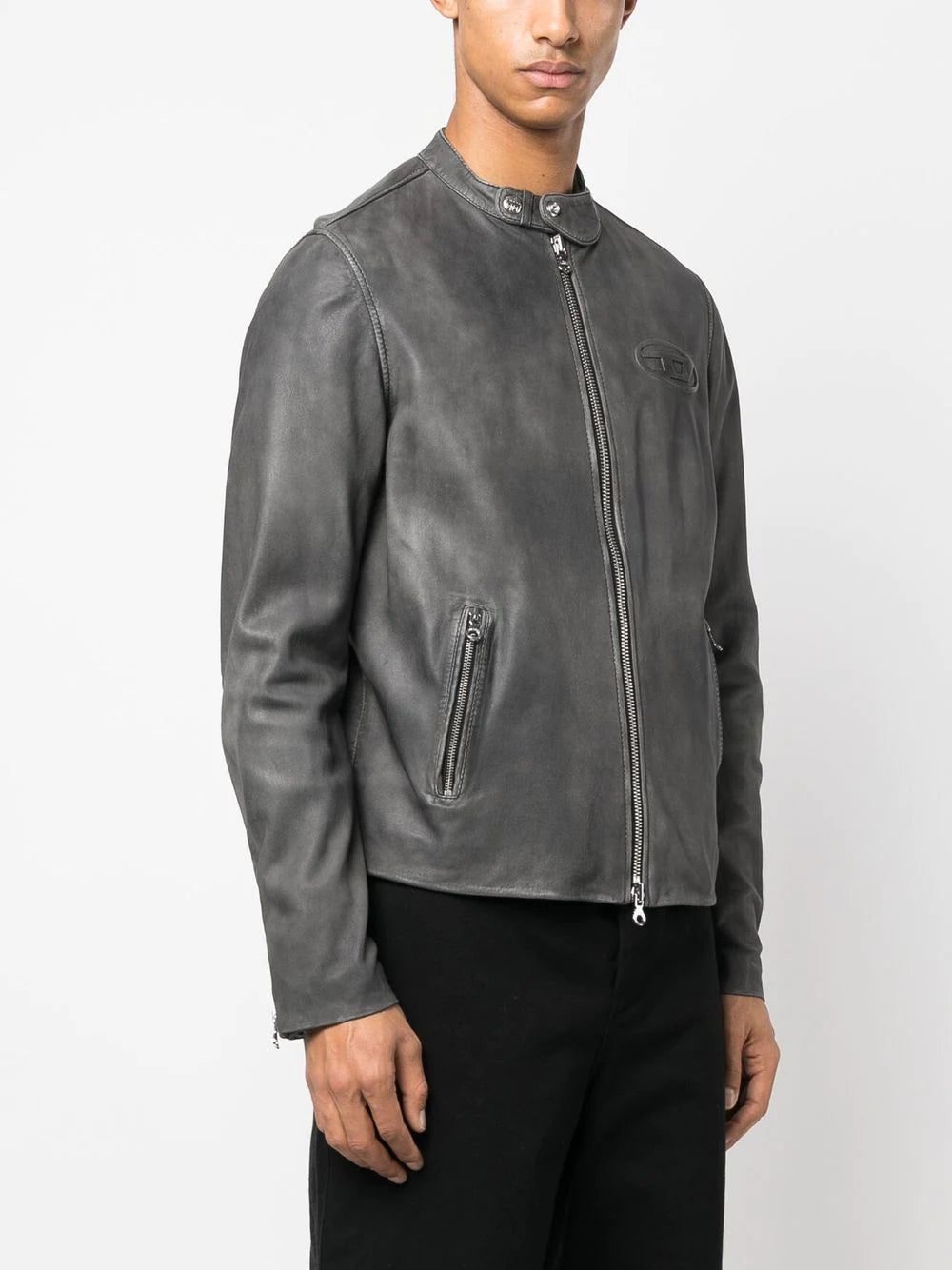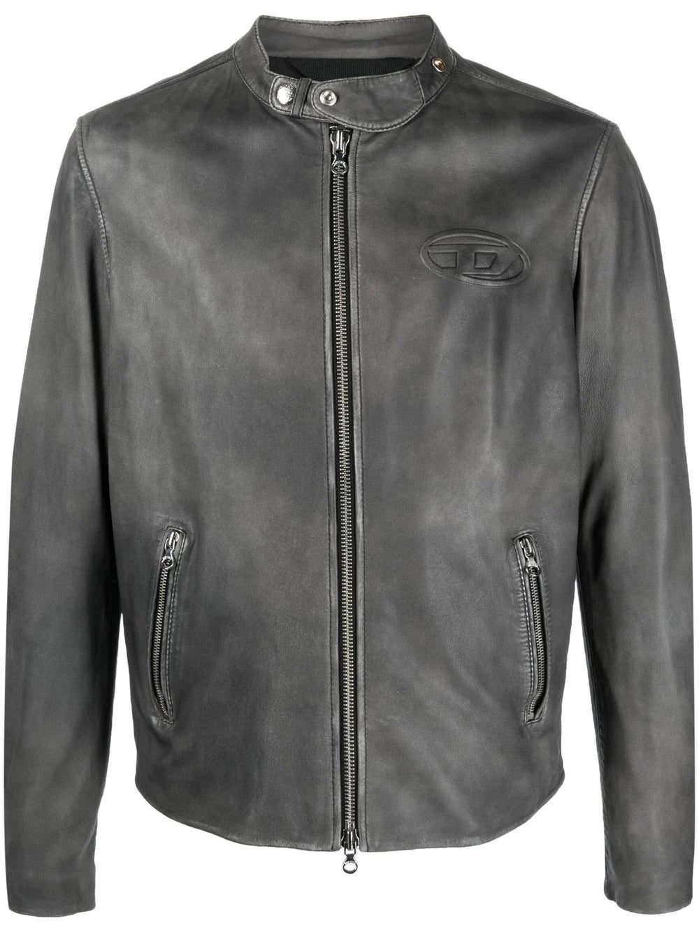 Realised in a light grey hue, this leather jacket from Diesel is characterised by a distressed finish, exhibiting the brand's street-style aesthetic. Meanwhile, an embossed logo to the chest serves as an instant identifier of the brand.