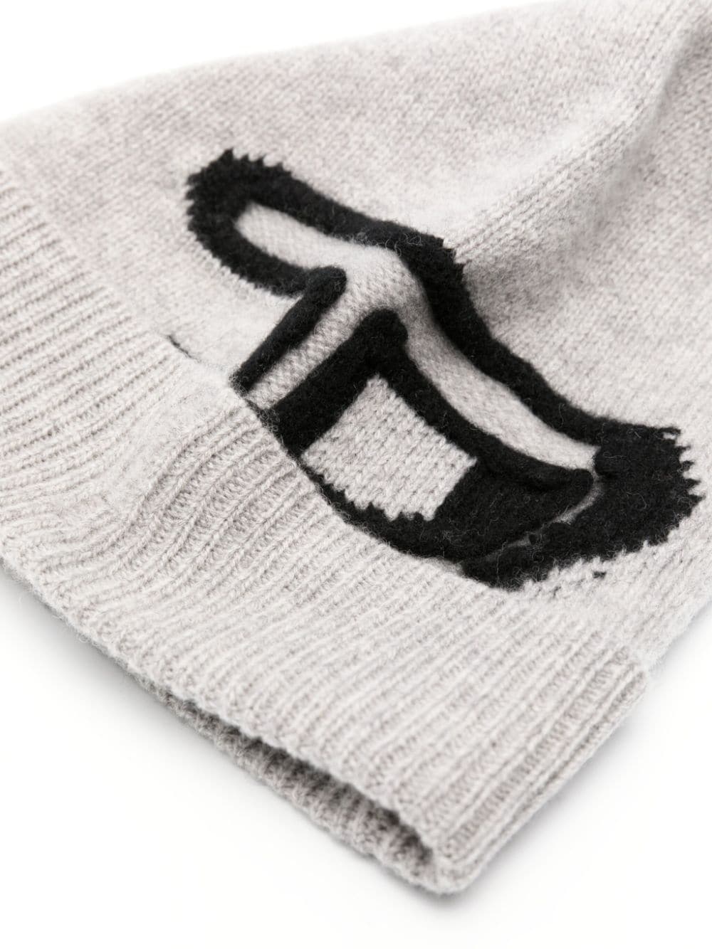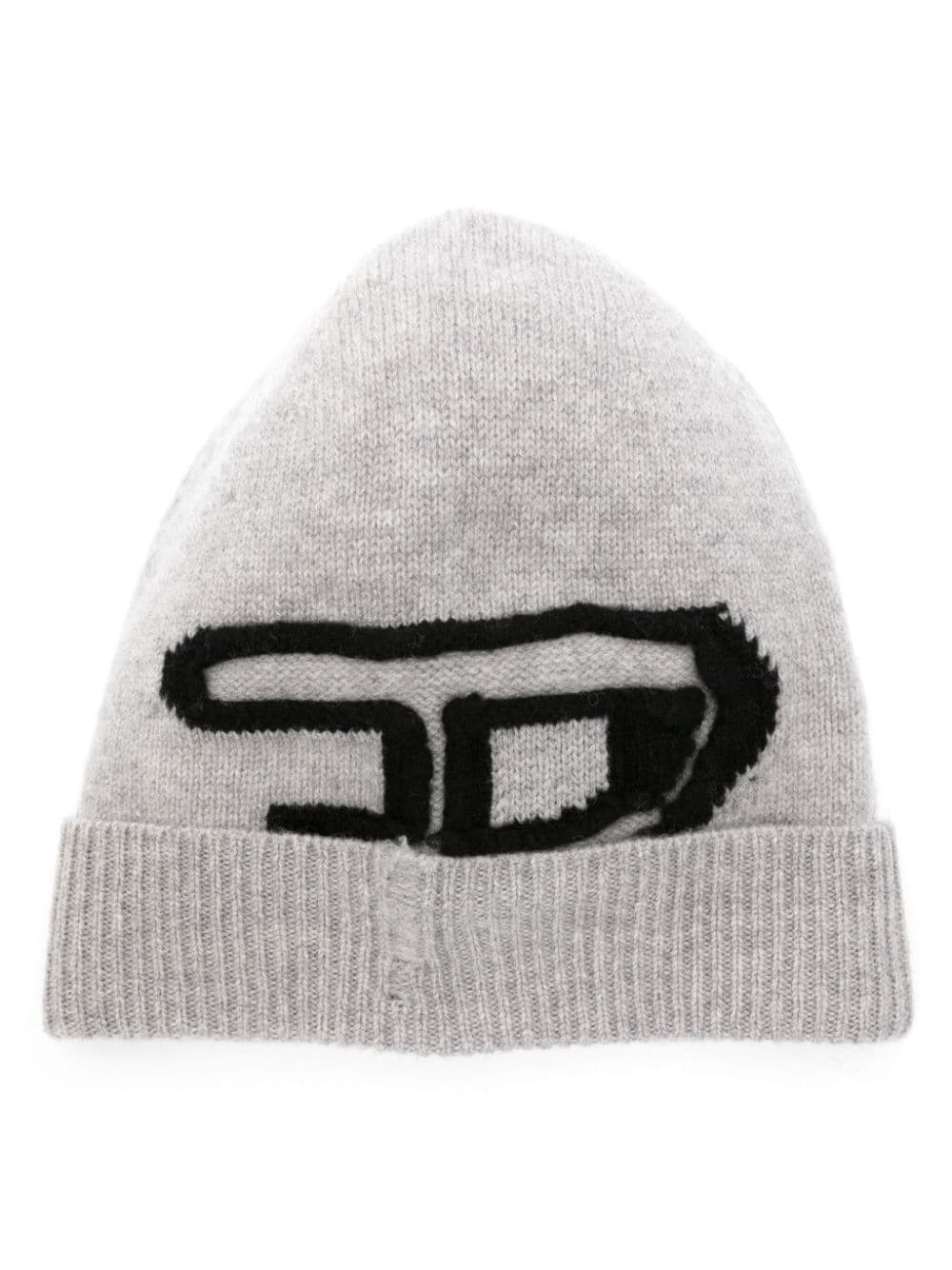 This heather-grey Diesel beanie is spun from grey wool with an intarsia Oval D logo that’s ‘knitted for a distinctive peel-off effect.’