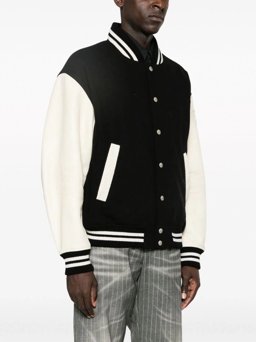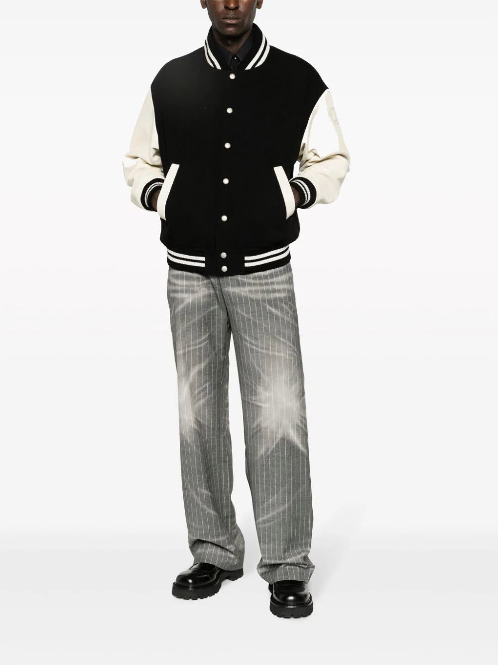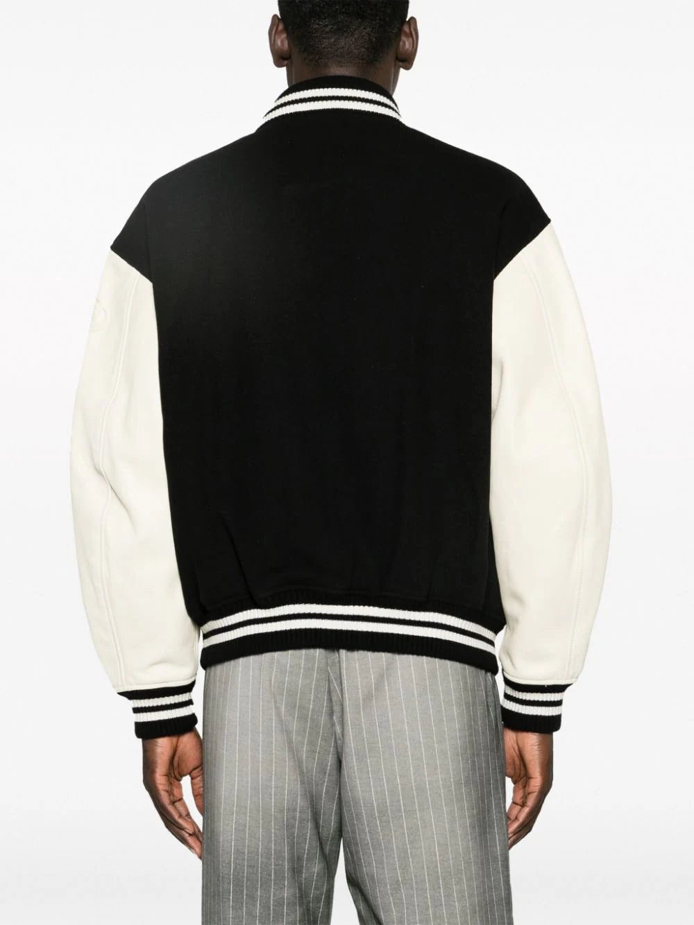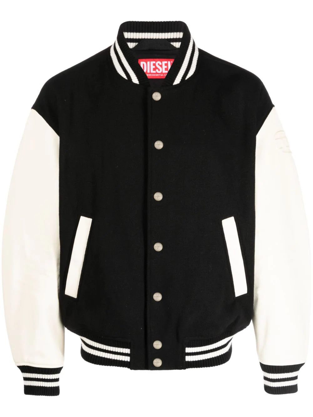 Diesel puts its stamp on the classic varsity jacket with this black and ivory version. It’s traced with customary striped ribbed trims and framed with contrasting sleeves – one is embossed with the brand’s signature Oval D logo.